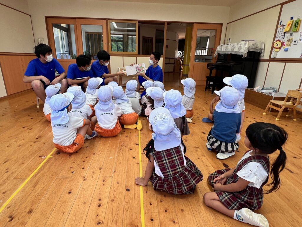 お兄さん、お姉さんが来てくれました。少し緊張気味です。 朝のお集りに参加しました。 各クラス毎に読み聞かせがありました。 -