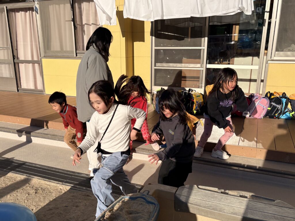 豆まきをしました。 おやつタイム 鬼ごっこスタート 人生ゲーム ぼくがほどいてあげる! 牛乳パックで駒や羽子板作り。 皆で大掃除頑張りました 寒くても外遊びが大好き!大きい山作るぞ! 皆でハイポーズ! 三輪車で電車ごっこ クラゲみたいな雲とハイチーズ! バスのお掃除のお手伝い 仲良く読書 冬休みの勉強も頑張っています。 インカニャンコンサートの様子。 芋掘りの様子。 園庭遊びの様子。 新しいバスに乗りました! 小さいブロックで頑張って作ってます。 折り紙 泥だんご作った! みんなでリレー! 大縄跳びできるかな。 虹と一緒にハイチーズ! アイス美味しい! 紙芝居を読んでくれました。 ビデオ鑑賞をしました。 折り紙でくす玉を作ってドッジボールをしました。 乾パンを食べました。 不審者対応を教えてもらいました。 お祭りごっこの様子 リレー始まるよ。 宿題の時間。 水遊び! 身体の部位当てゲーム。 きゅうりの収穫。 習字をしました。 畑でカニみつけたよ。 時計⑦ 時計⑥ 時計⑤ 時計④ 時計③ 時計② 時計① 時計の制作。 跳び箱! バイオリン演奏会! リレー! シャキーン! 見て見て~ 畑作りと芋の苗植え。 ハイチーズ! 水を使って泥んこ遊びが始まりました。 地域の方との交流。桜の木を見に行きました。 小さいクラスのお友達と遊んでます。 畑を耕してくれてます。 玉ねぎ収穫をしました! ラキューを使ってたくさんの作品が出来ました。 おやつタイム! たくさん砂がきました! 学童 2025年度