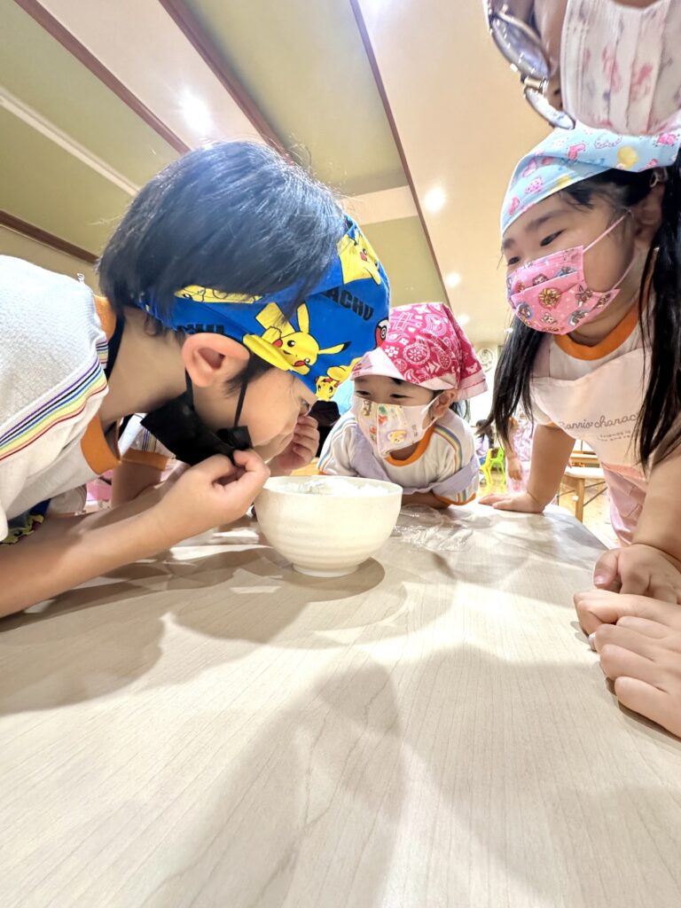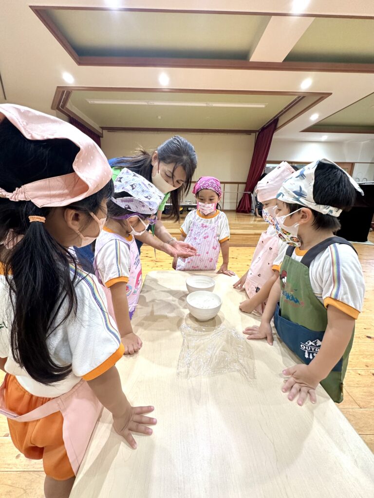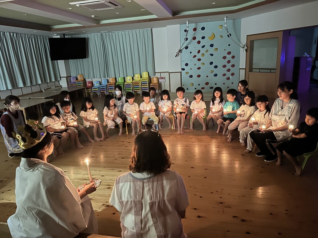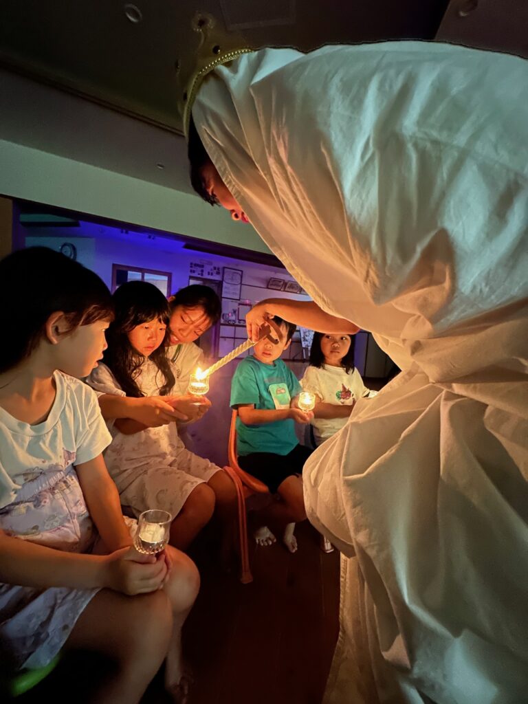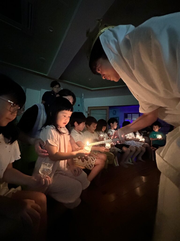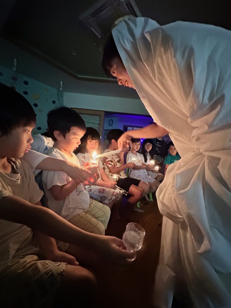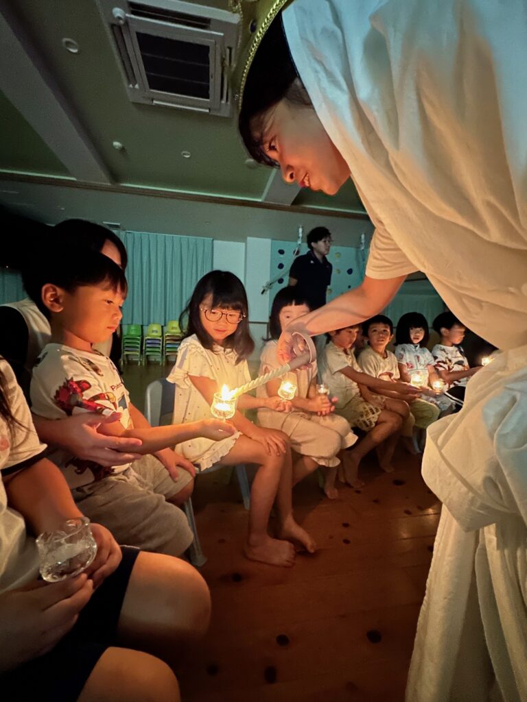 お月見お団子作り! 上手にお団子ができました。 結団式!! 宝探しゲームスタート!2チームに分かれて宝を探します。 特別な宝を発見!! 夜ご飯は、たくさんおかわりしてお腹いっぱい食べました。 ごちそうさまの後、外を見ると雨がやんでいて、今なら花火できる!!と花火観賞をしました。 お月様も顔を出してくれました。花火が終わり園に入ると雷がゴロゴロ・・・花火が見れてよかったね!と話しました。 シャワーを浴びた後にキャンドルサービスをしました。 なんでもがんばれる火、身体が強くなれる火、優しいお兄さん、お姉さんになる火などいろんな火を一人一人もらいました。最後に火遊びはしませんと約束もしてます。 おやすみなさい。 2日目の朝はお散歩に行きました。 朝の体操 朝ごはんを食べました。 解散式。 おやつタイム。子ども達からたくさんのお話しを聞いてください。 お泊まり保育(おひさま組)