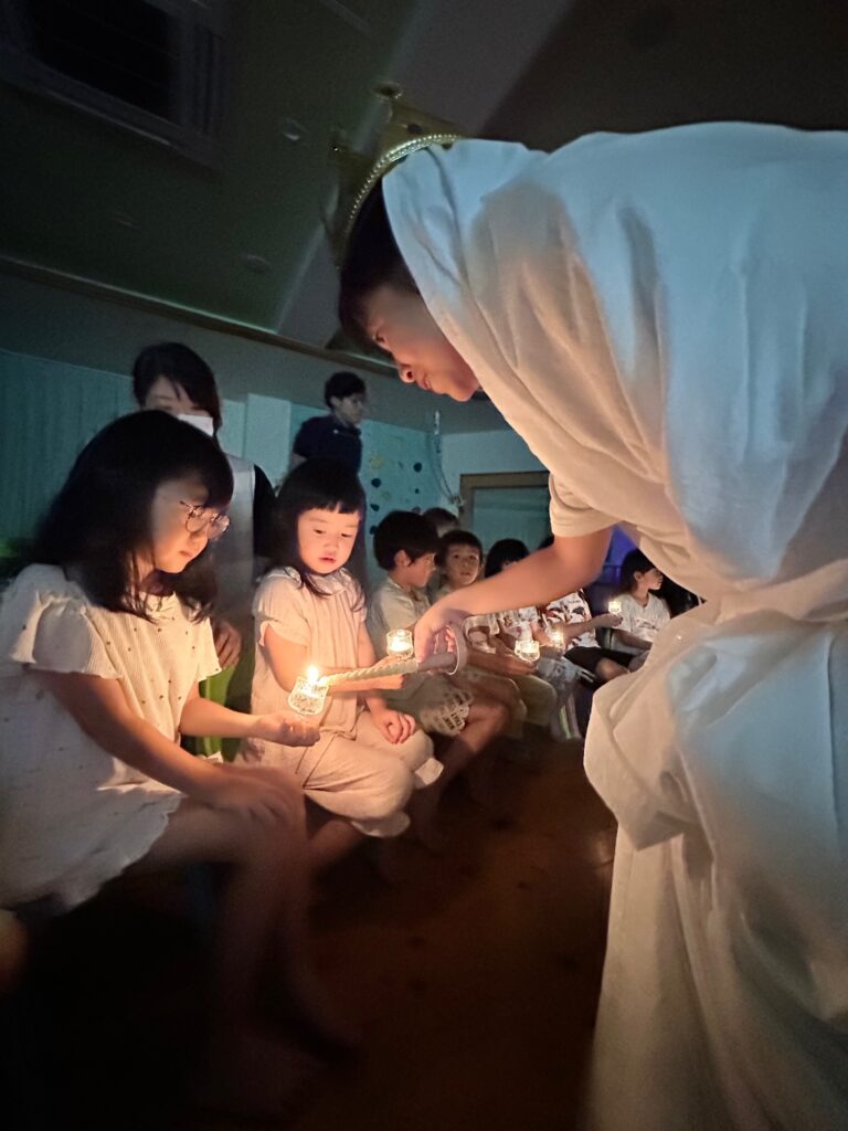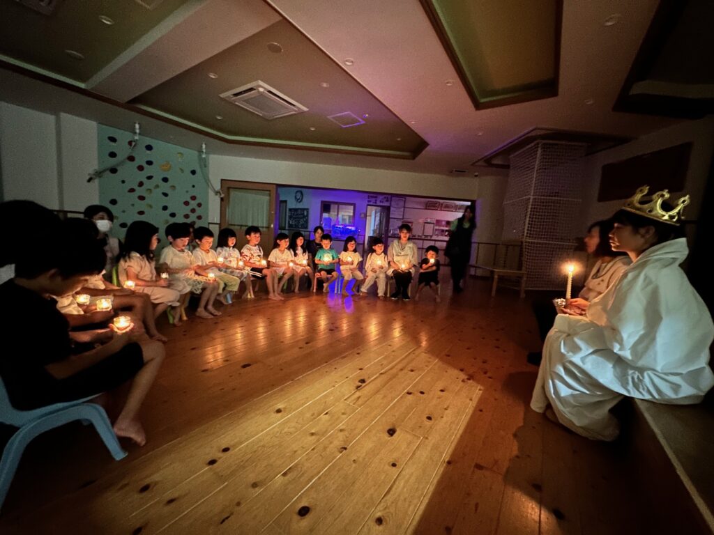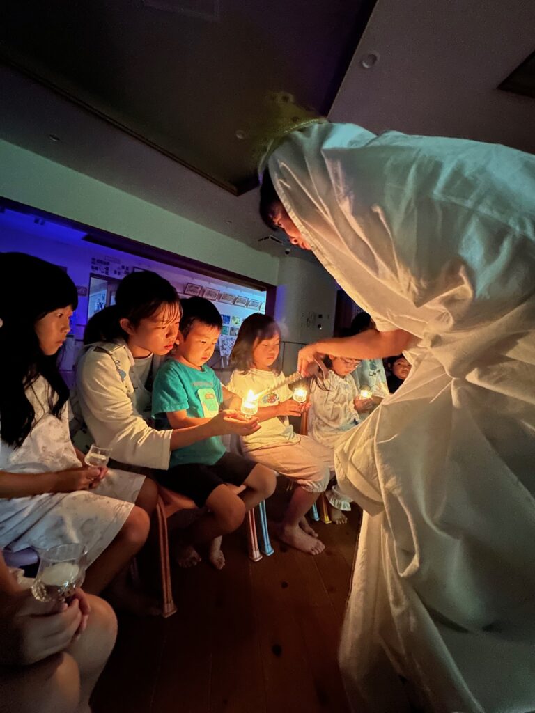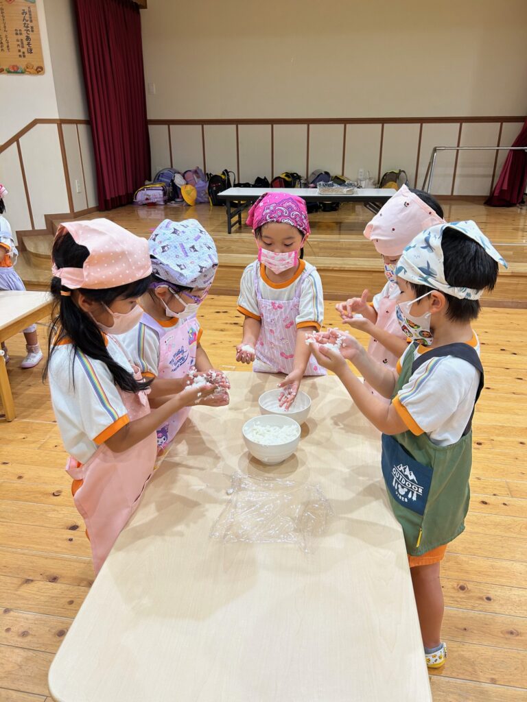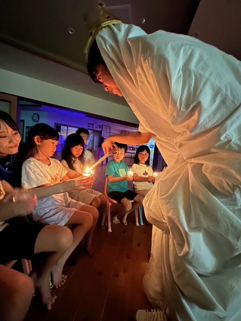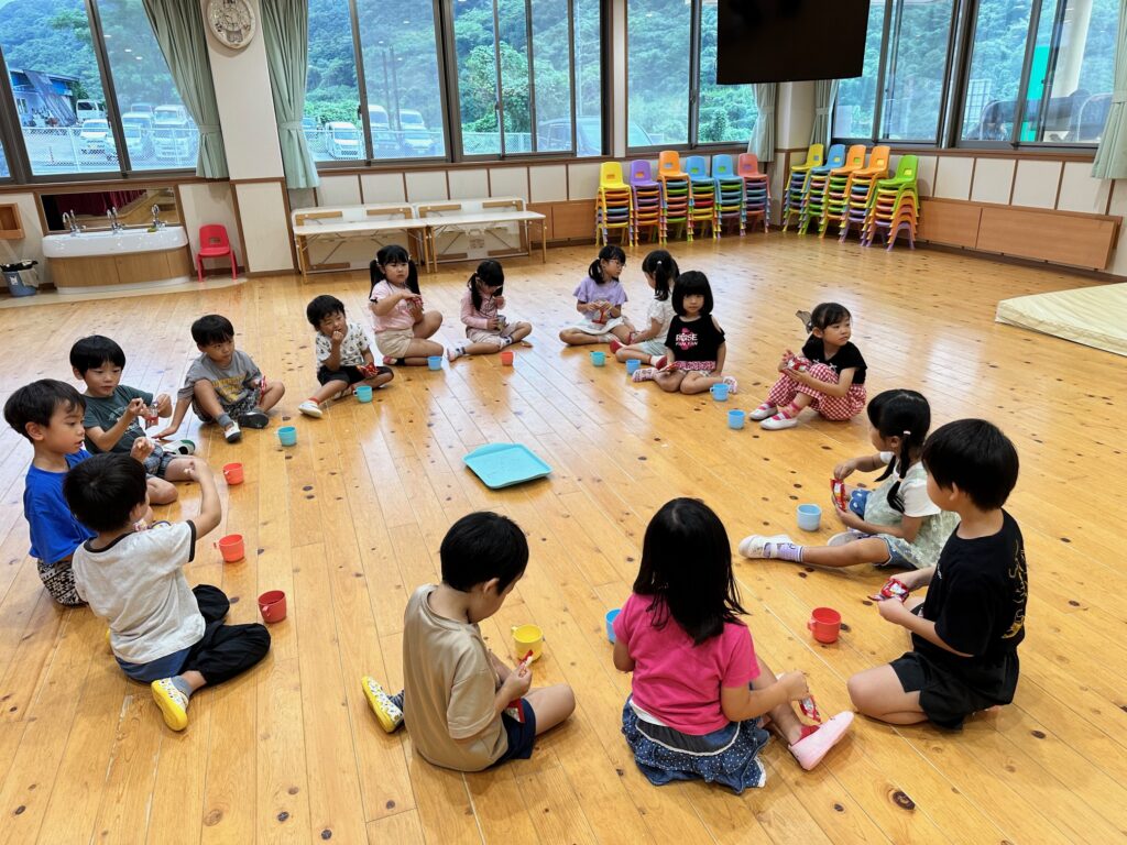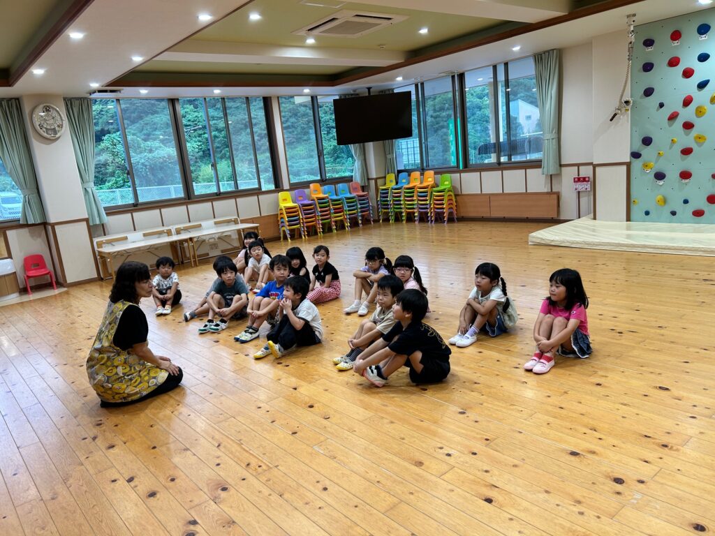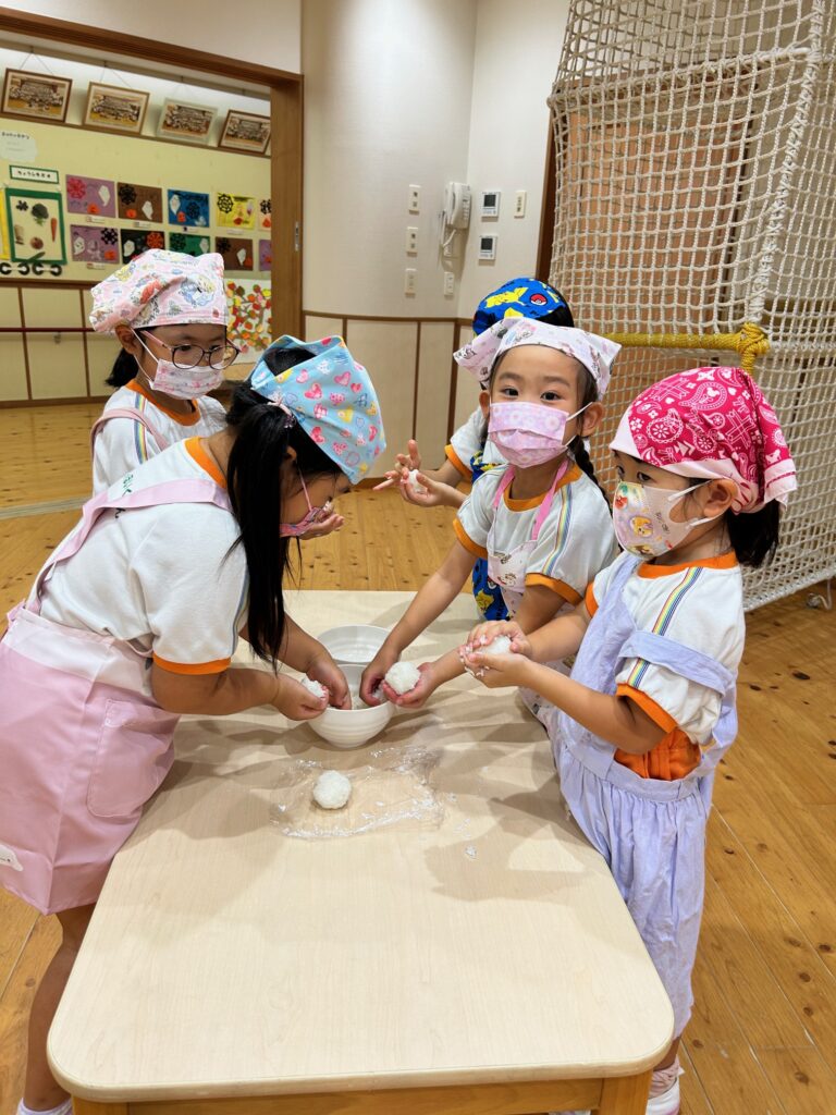 お月見お団子作り! 上手にお団子ができました。 結団式!! 宝探しゲームスタート!2チームに分かれて宝を探します。 特別な宝を発見!! 夜ご飯は、たくさんおかわりしてお腹いっぱい食べました。 ごちそうさまの後、外を見ると雨がやんでいて、今なら花火できる!!と花火観賞をしました。 お月様も顔を出してくれました。花火が終わり園に入ると雷がゴロゴロ・・・花火が見れてよかったね!と話しました。 シャワーを浴びた後にキャンドルサービスをしました。 なんでもがんばれる火、身体が強くなれる火、優しいお兄さん、お姉さんになる火などいろんな火を一人一人もらいました。最後に火遊びはしませんと約束もしてます。 おやすみなさい。 2日目の朝はお散歩に行きました。 朝の体操 朝ごはんを食べました。 解散式。 おやつタイム。子ども達からたくさんのお話しを聞いてください。 お泊まり保育(おひさま組)