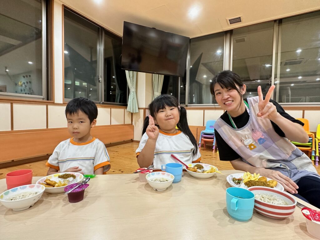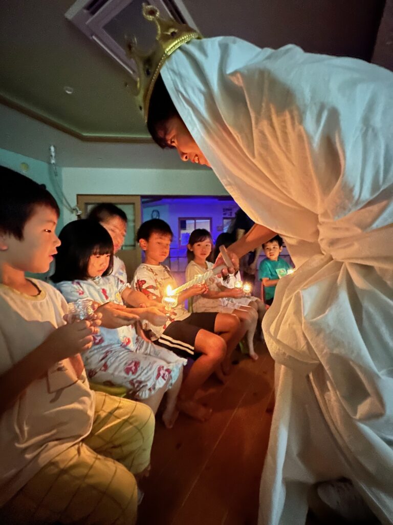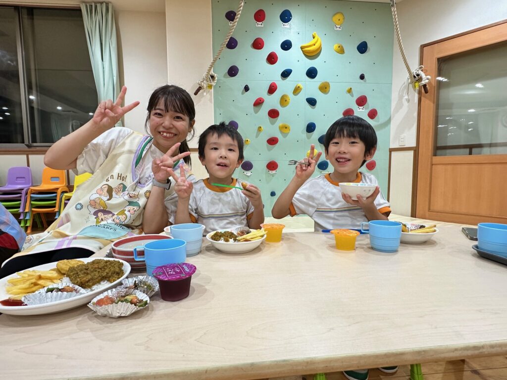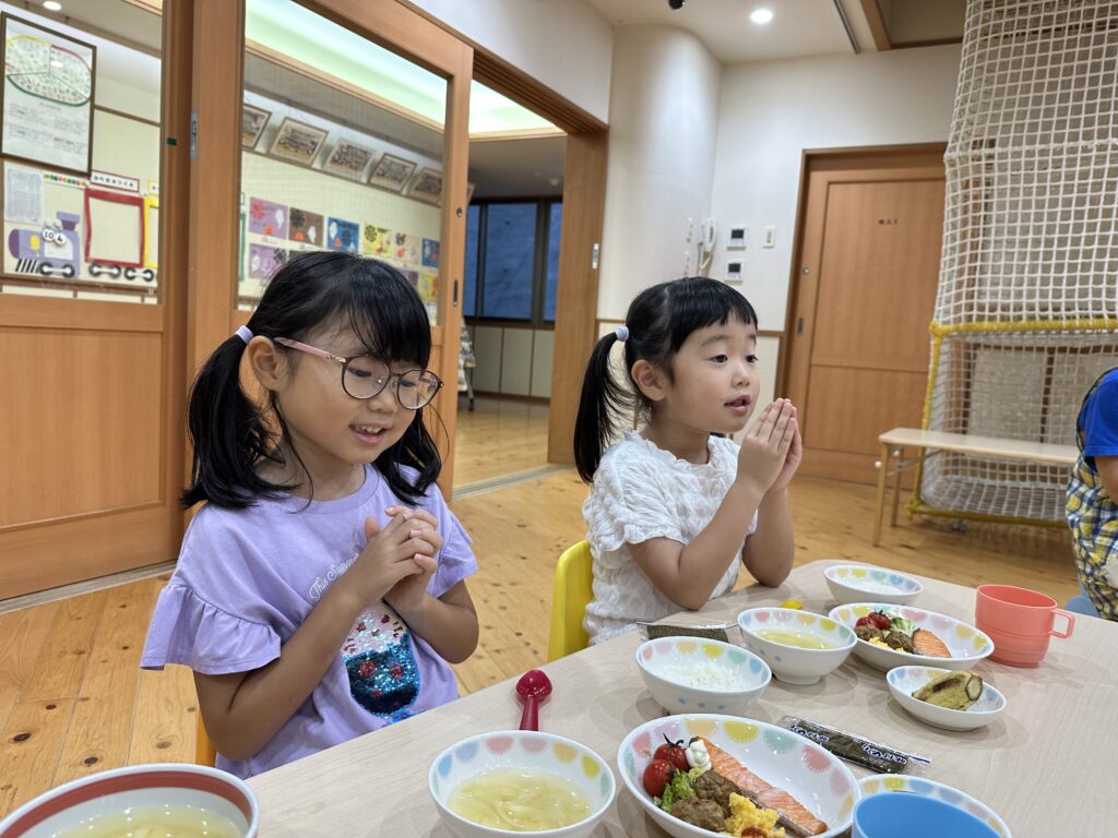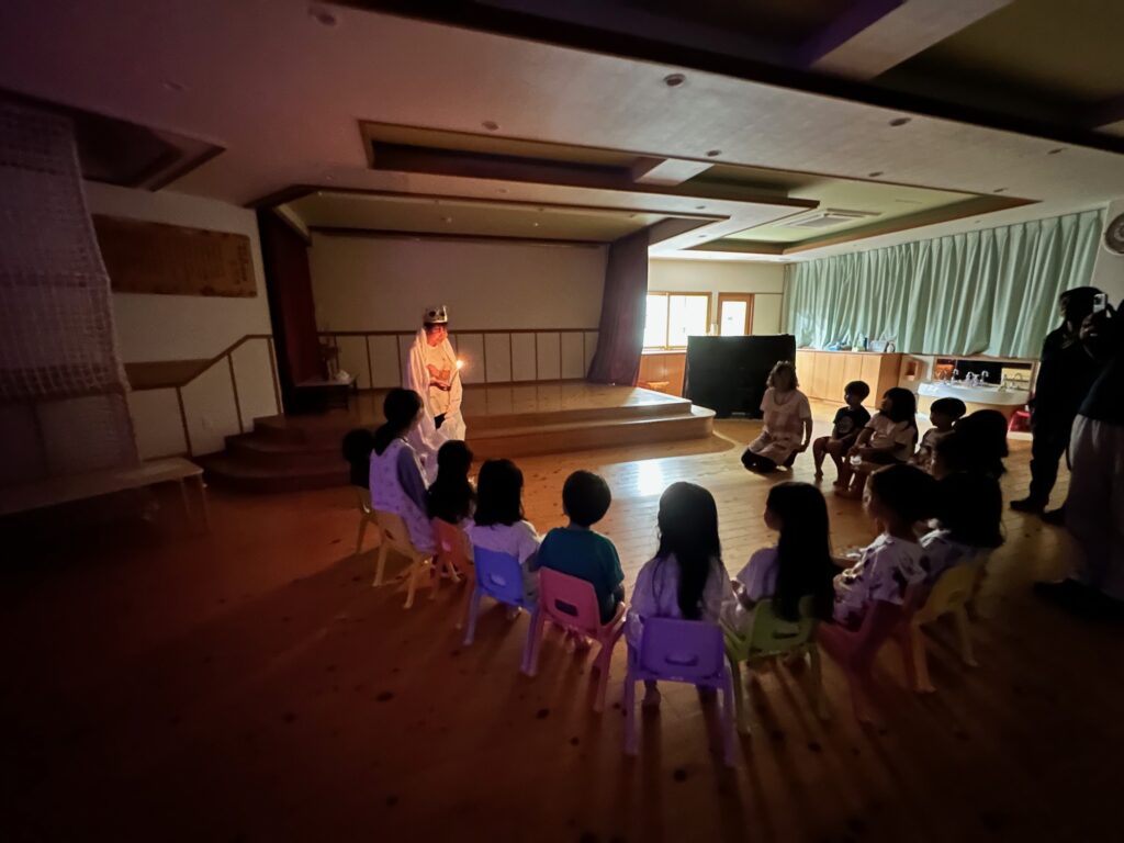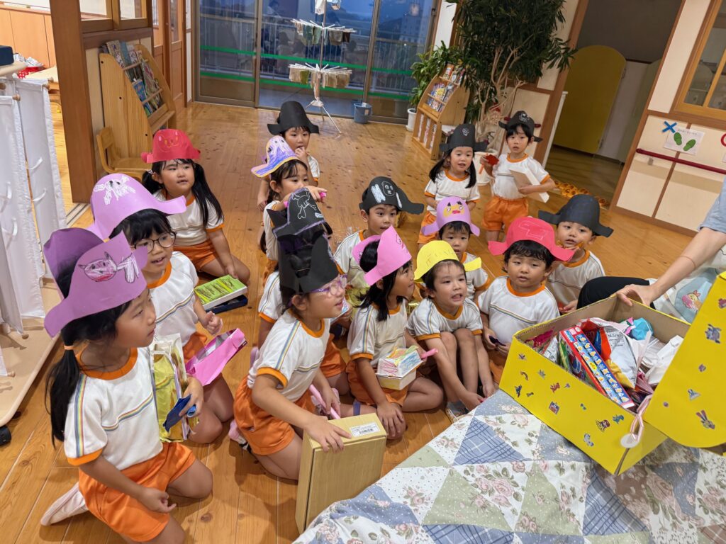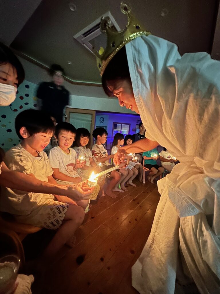 お月見お団子作り! 上手にお団子ができました。 結団式!! 宝探しゲームスタート!2チームに分かれて宝を探します。 特別な宝を発見!! 夜ご飯は、たくさんおかわりしてお腹いっぱい食べました。 ごちそうさまの後、外を見ると雨がやんでいて、今なら花火できる!!と花火観賞をしました。 お月様も顔を出してくれました。花火が終わり園に入ると雷がゴロゴロ・・・花火が見れてよかったね!と話しました。 シャワーを浴びた後にキャンドルサービスをしました。 なんでもがんばれる火、身体が強くなれる火、優しいお兄さん、お姉さんになる火などいろんな火を一人一人もらいました。最後に火遊びはしませんと約束もしてます。 おやすみなさい。 2日目の朝はお散歩に行きました。 朝の体操 朝ごはんを食べました。 解散式。 おやつタイム。子ども達からたくさんのお話しを聞いてください。 お泊まり保育(おひさま組)