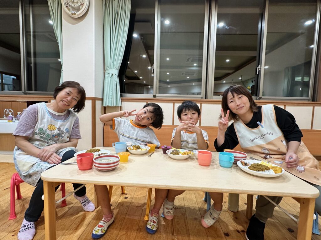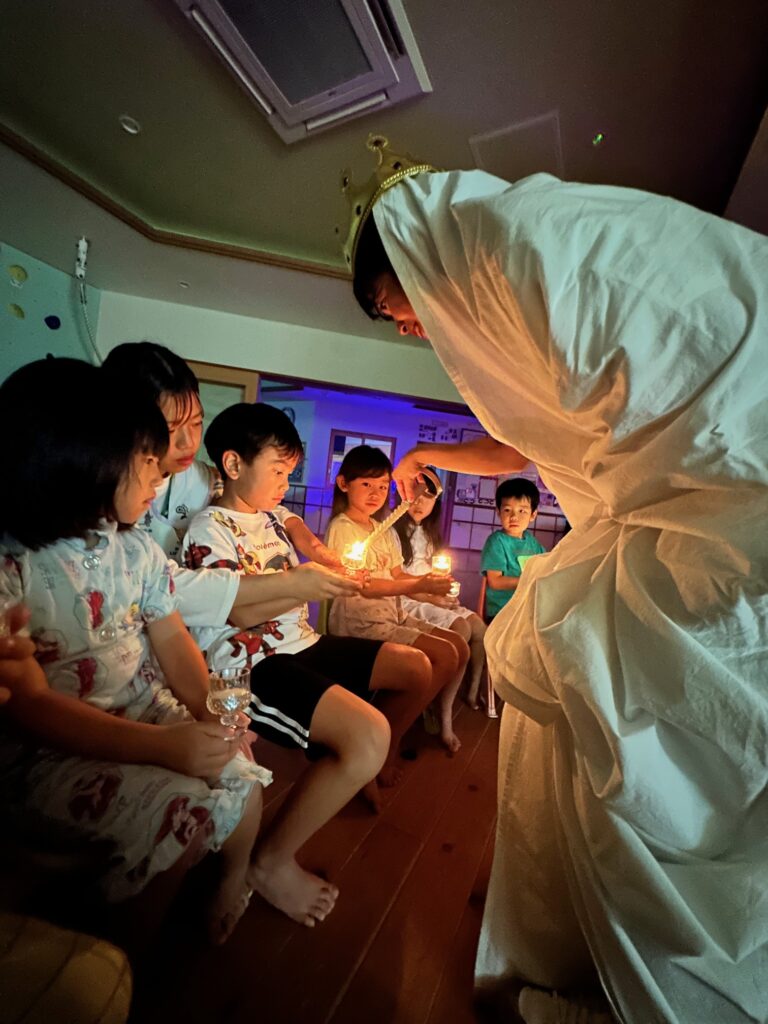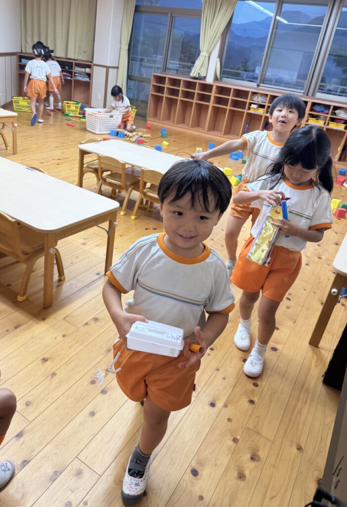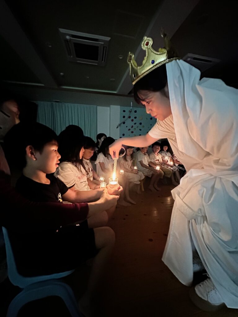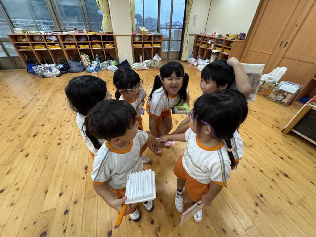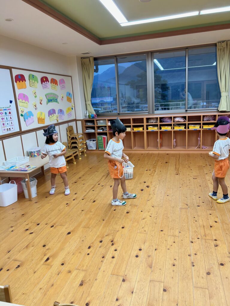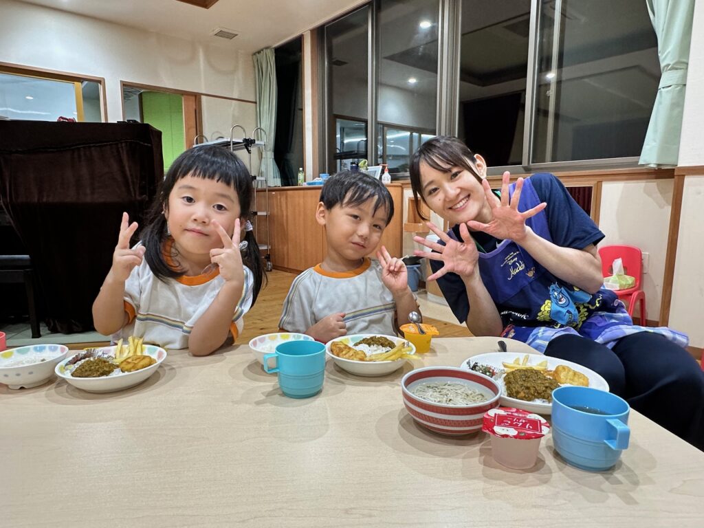 お月見お団子作り! 上手にお団子ができました。 結団式!! 宝探しゲームスタート!2チームに分かれて宝を探します。 特別な宝を発見!! 夜ご飯は、たくさんおかわりしてお腹いっぱい食べました。 ごちそうさまの後、外を見ると雨がやんでいて、今なら花火できる!!と花火観賞をしました。 お月様も顔を出してくれました。花火が終わり園に入ると雷がゴロゴロ・・・花火が見れてよかったね!と話しました。 シャワーを浴びた後にキャンドルサービスをしました。 なんでもがんばれる火、身体が強くなれる火、優しいお兄さん、お姉さんになる火などいろんな火を一人一人もらいました。最後に火遊びはしませんと約束もしてます。 おやすみなさい。 2日目の朝はお散歩に行きました。 朝の体操 朝ごはんを食べました。 解散式。 おやつタイム。子ども達からたくさんのお話しを聞いてください。 お泊まり保育(おひさま組)