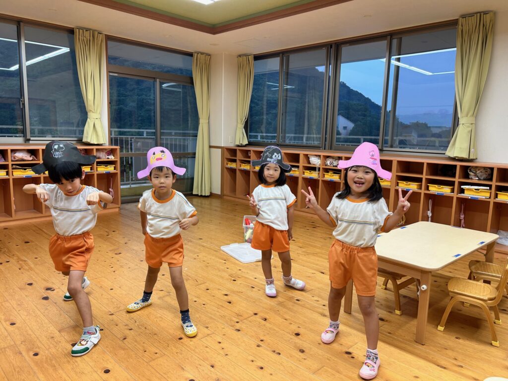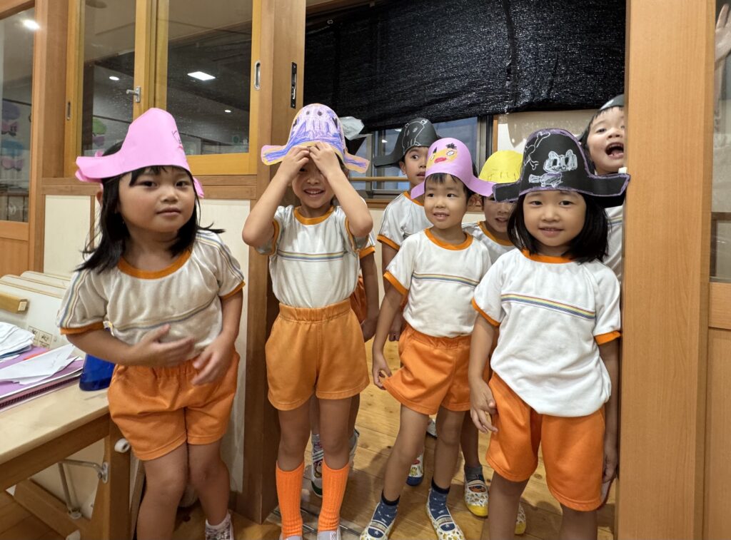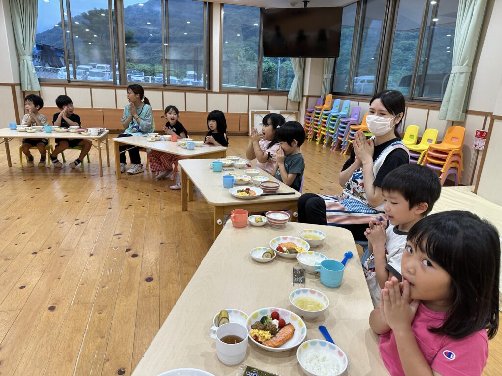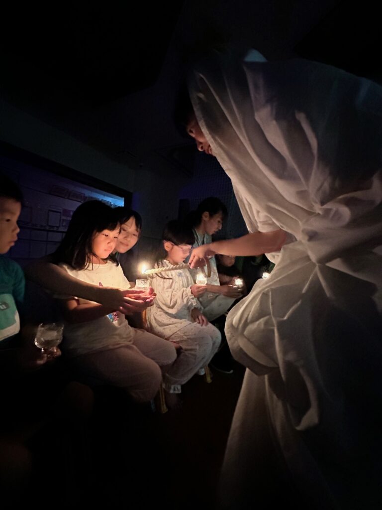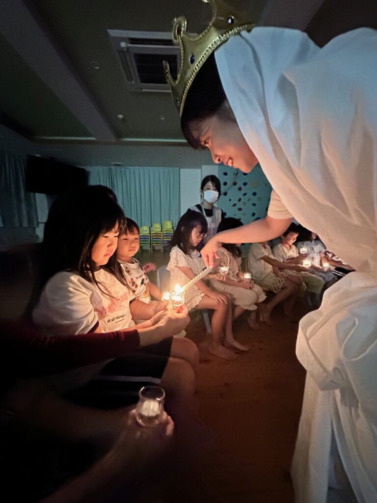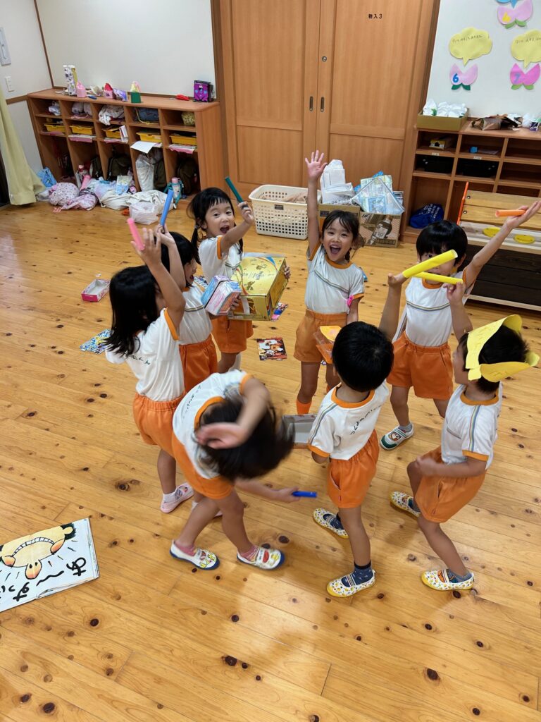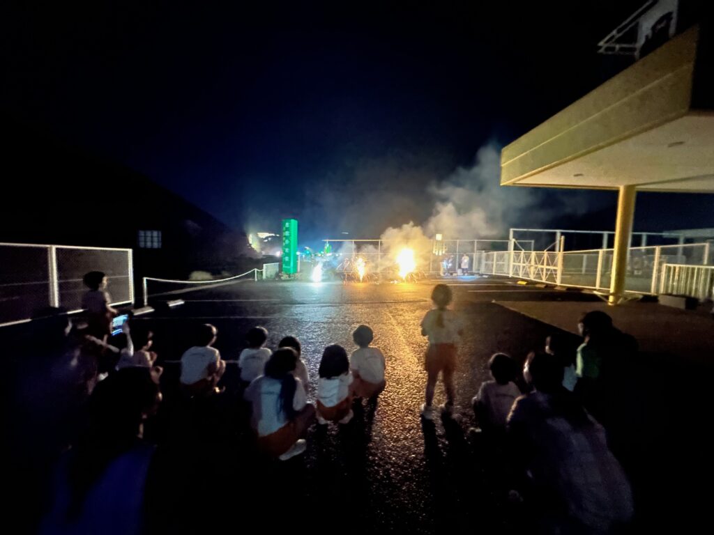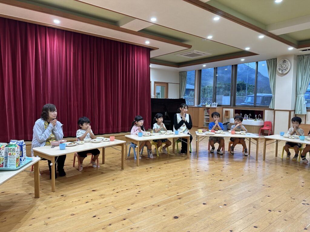 お月見お団子作り! 上手にお団子ができました。 結団式!! 宝探しゲームスタート!2チームに分かれて宝を探します。 特別な宝を発見!! 夜ご飯は、たくさんおかわりしてお腹いっぱい食べました。 ごちそうさまの後、外を見ると雨がやんでいて、今なら花火できる!!と花火観賞をしました。 お月様も顔を出してくれました。花火が終わり園に入ると雷がゴロゴロ・・・花火が見れてよかったね!と話しました。 シャワーを浴びた後にキャンドルサービスをしました。 なんでもがんばれる火、身体が強くなれる火、優しいお兄さん、お姉さんになる火などいろんな火を一人一人もらいました。最後に火遊びはしませんと約束もしてます。 おやすみなさい。 2日目の朝はお散歩に行きました。 朝の体操 朝ごはんを食べました。 解散式。 おやつタイム。子ども達からたくさんのお話しを聞いてください。 お泊まり保育(おひさま組)