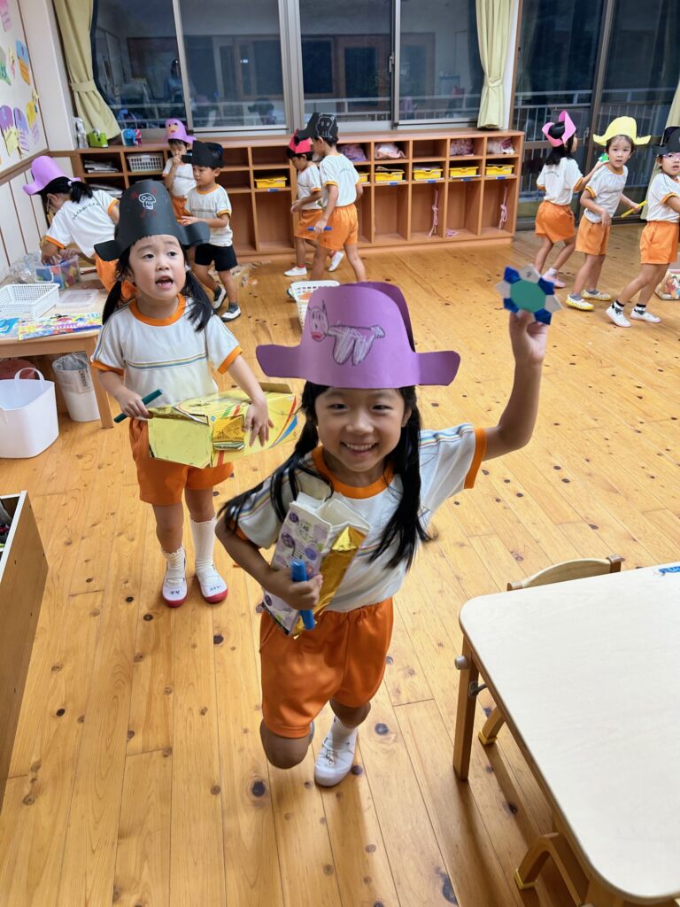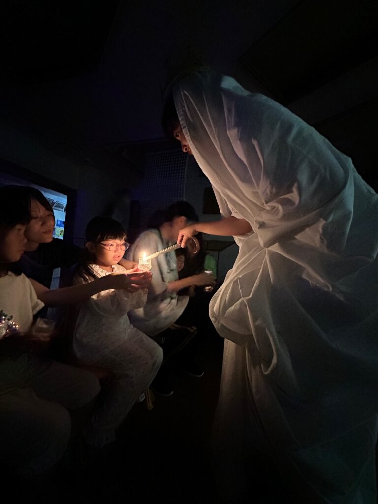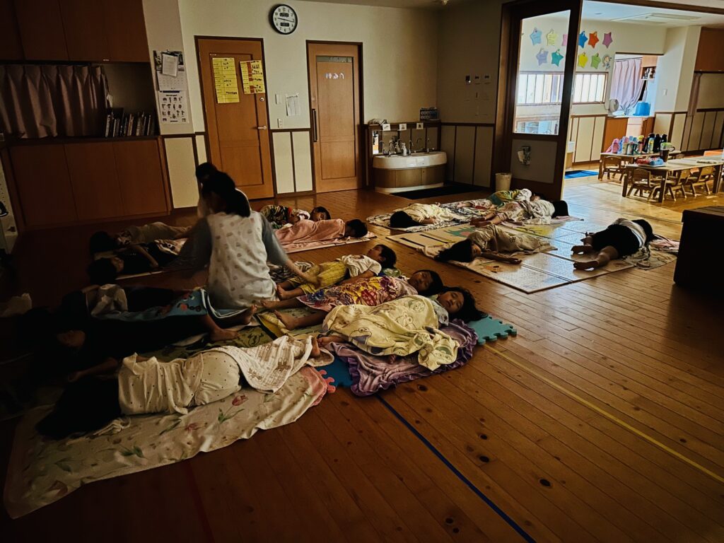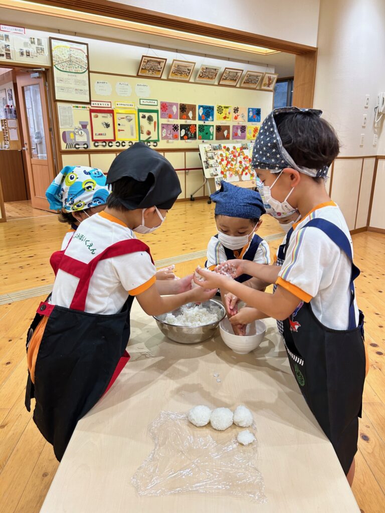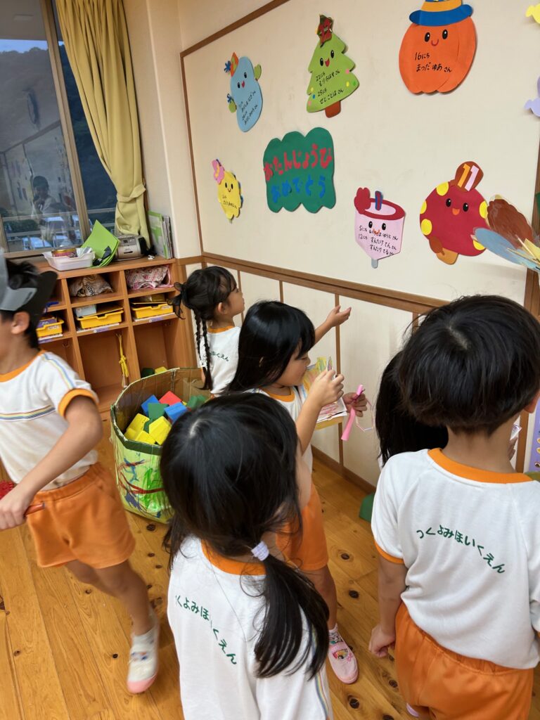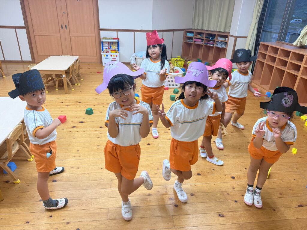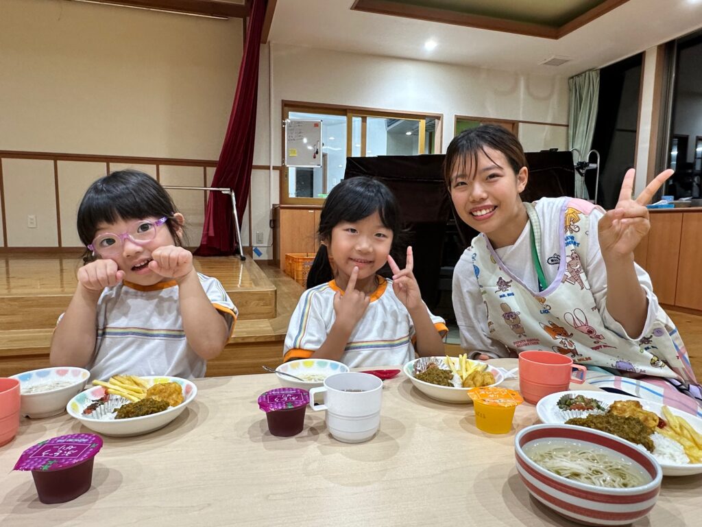 お月見お団子作り! 上手にお団子ができました。 結団式!! 宝探しゲームスタート!2チームに分かれて宝を探します。 特別な宝を発見!! 夜ご飯は、たくさんおかわりしてお腹いっぱい食べました。 ごちそうさまの後、外を見ると雨がやんでいて、今なら花火できる!!と花火観賞をしました。 お月様も顔を出してくれました。花火が終わり園に入ると雷がゴロゴロ・・・花火が見れてよかったね!と話しました。 シャワーを浴びた後にキャンドルサービスをしました。 なんでもがんばれる火、身体が強くなれる火、優しいお兄さん、お姉さんになる火などいろんな火を一人一人もらいました。最後に火遊びはしませんと約束もしてます。 おやすみなさい。 2日目の朝はお散歩に行きました。 朝の体操 朝ごはんを食べました。 解散式。 おやつタイム。子ども達からたくさんのお話しを聞いてください。 お泊まり保育(おひさま組)