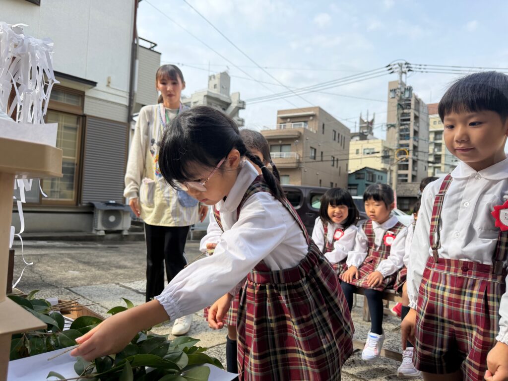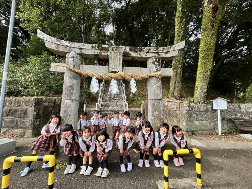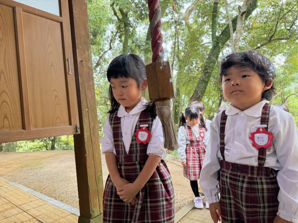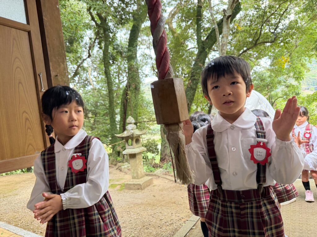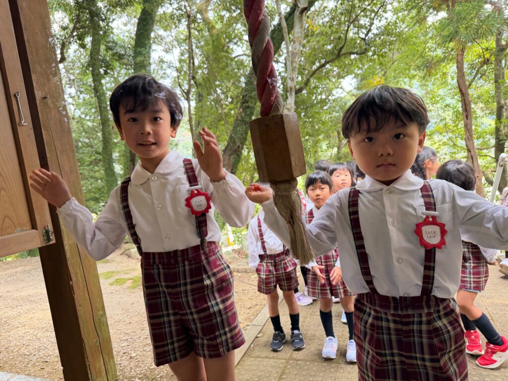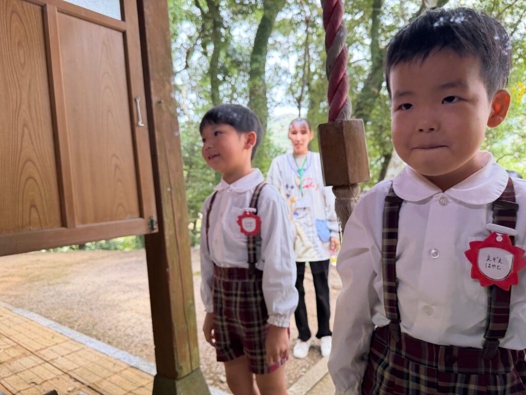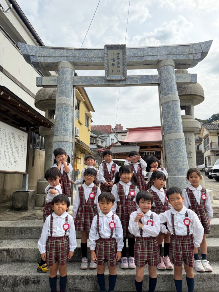 宮地嶽八幡神社へ七五三参りへ行ってきました。奥の鳥居は陶器で作られています。 玉串奉奠 2礼2拍手1礼をして1人ずつ玉串を捧げました。 滞りなく参拝することができました。これまでの子ども達の成長と今後の健康を祈願しました。 子々川郷の熊野神社へ参拝しました。 園長先生より、お守りを頂きました。 参拝後にお買い物体験をしました。 本日、お守りとお買い物体験で購入したおやつを持ち帰っています。ご家庭で今日のお話しをたくさん聞いてみてください。これからも、健康で元気にたくさん遊んで過ごすことができますように。 七五三参り(おひさま組)