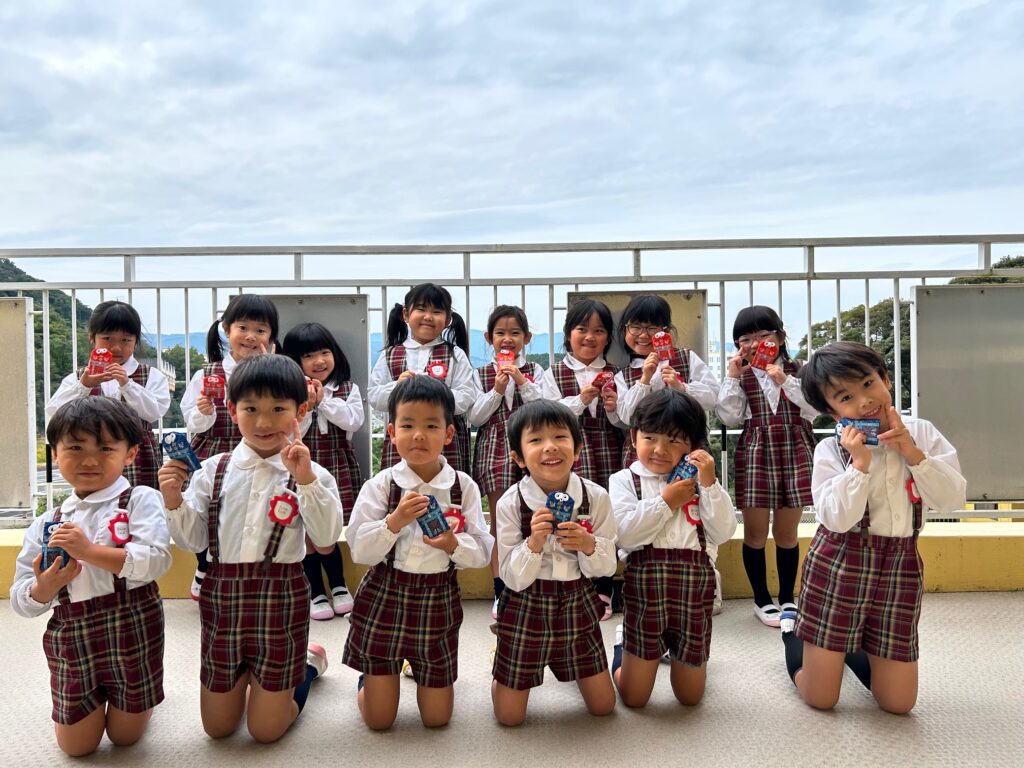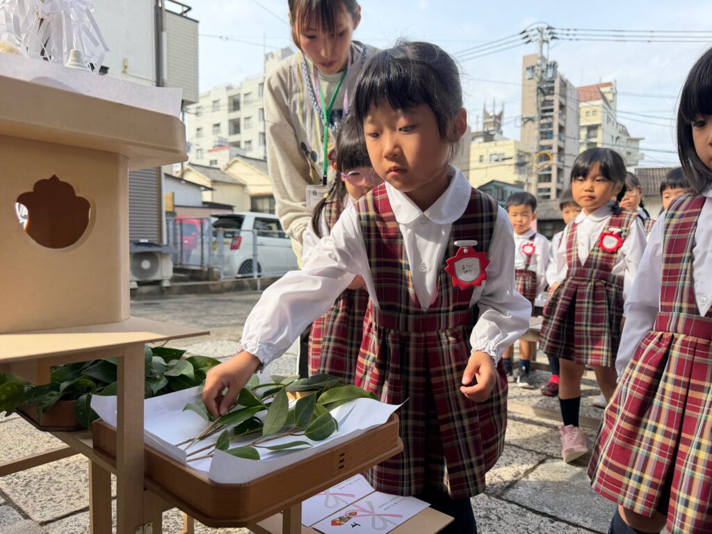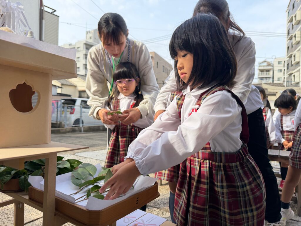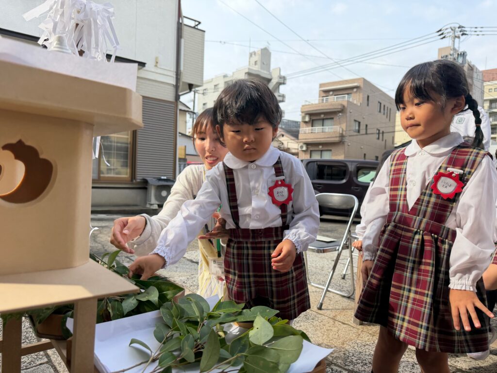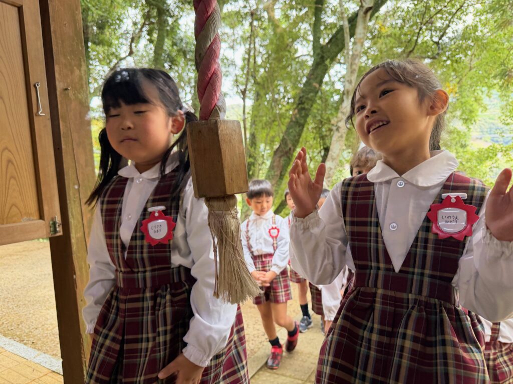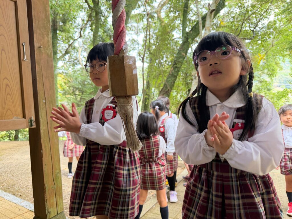 宮地嶽八幡神社へ七五三参りへ行ってきました。奥の鳥居は陶器で作られています。 玉串奉奠 2礼2拍手1礼をして1人ずつ玉串を捧げました。 滞りなく参拝することができました。これまでの子ども達の成長と今後の健康を祈願しました。 子々川郷の熊野神社へ参拝しました。 園長先生より、お守りを頂きました。 参拝後にお買い物体験をしました。 本日、お守りとお買い物体験で購入したおやつを持ち帰っています。ご家庭で今日のお話しをたくさん聞いてみてください。これからも、健康で元気にたくさん遊んで過ごすことができますように。 七五三参り(おひさま組)