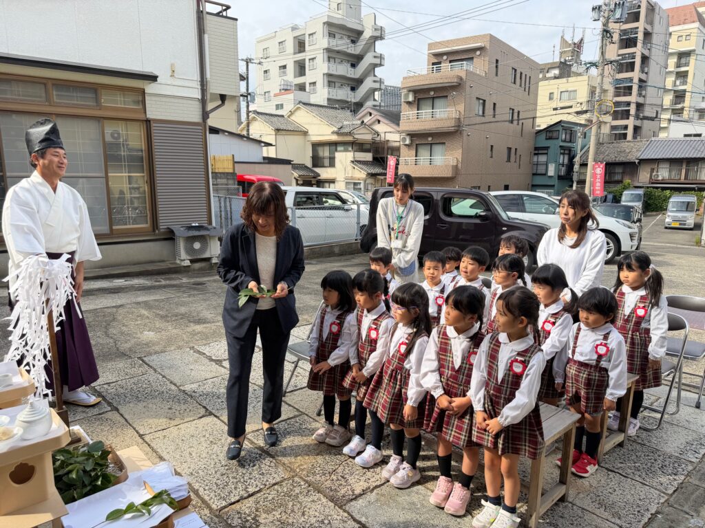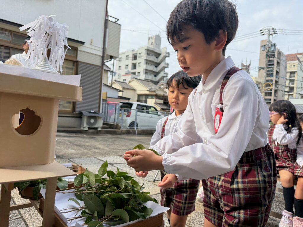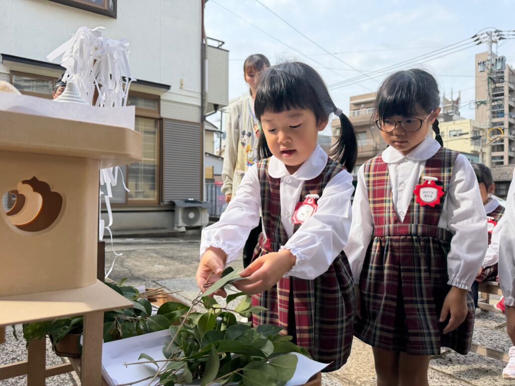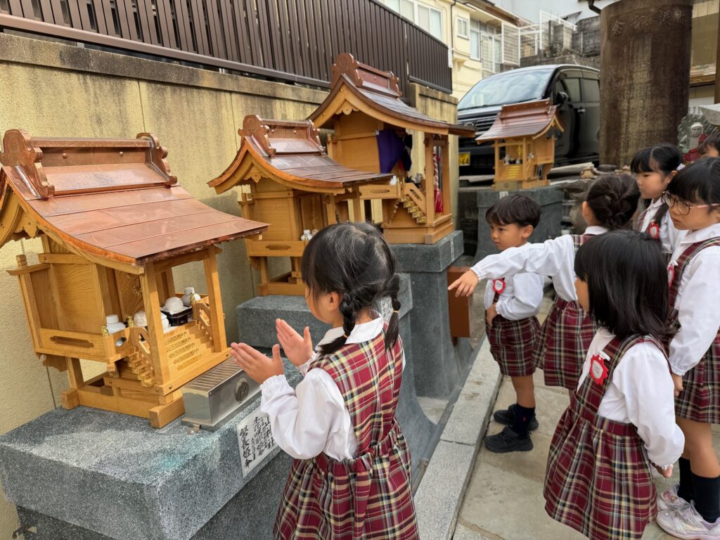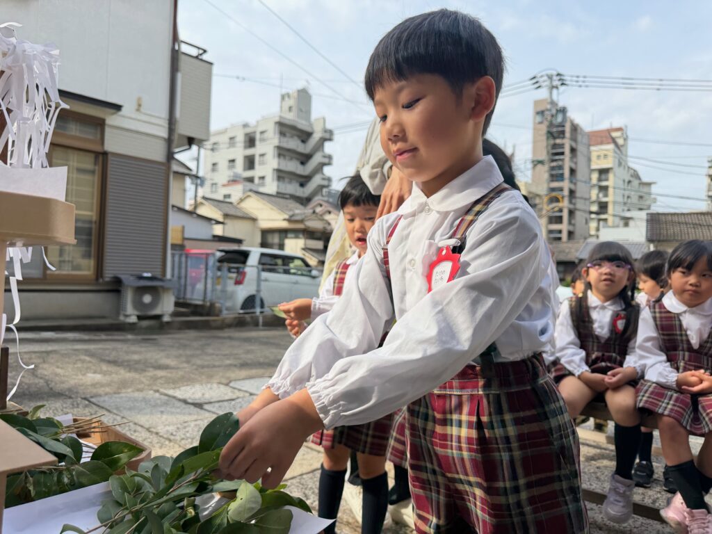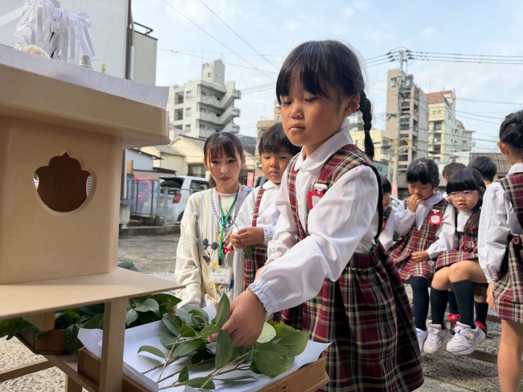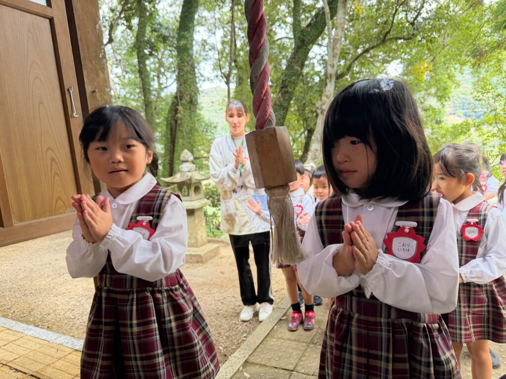 宮地嶽八幡神社へ七五三参りへ行ってきました。奥の鳥居は陶器で作られています。 玉串奉奠 2礼2拍手1礼をして1人ずつ玉串を捧げました。 滞りなく参拝することができました。これまでの子ども達の成長と今後の健康を祈願しました。 子々川郷の熊野神社へ参拝しました。 園長先生より、お守りを頂きました。 参拝後にお買い物体験をしました。 本日、お守りとお買い物体験で購入したおやつを持ち帰っています。ご家庭で今日のお話しをたくさん聞いてみてください。これからも、健康で元気にたくさん遊んで過ごすことができますように。 七五三参り(おひさま組)