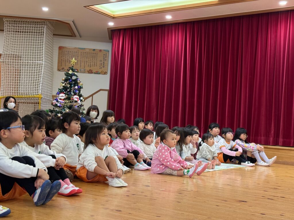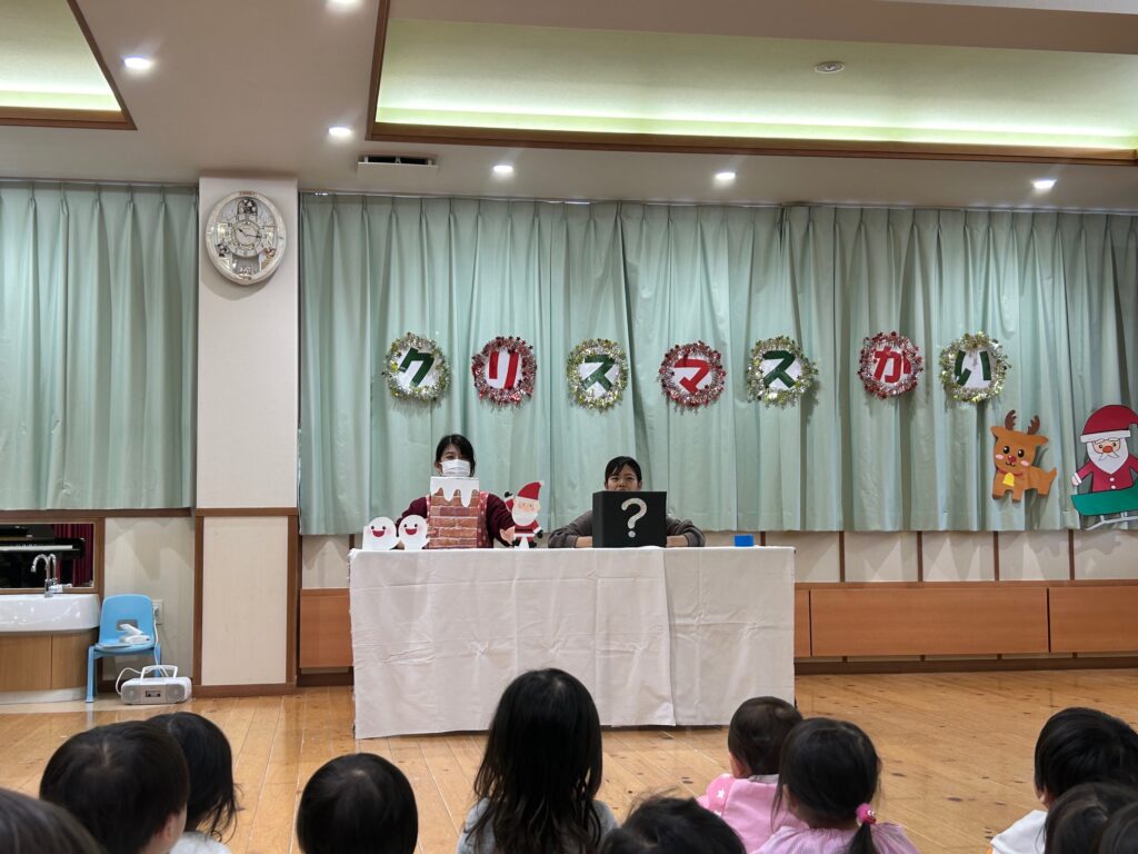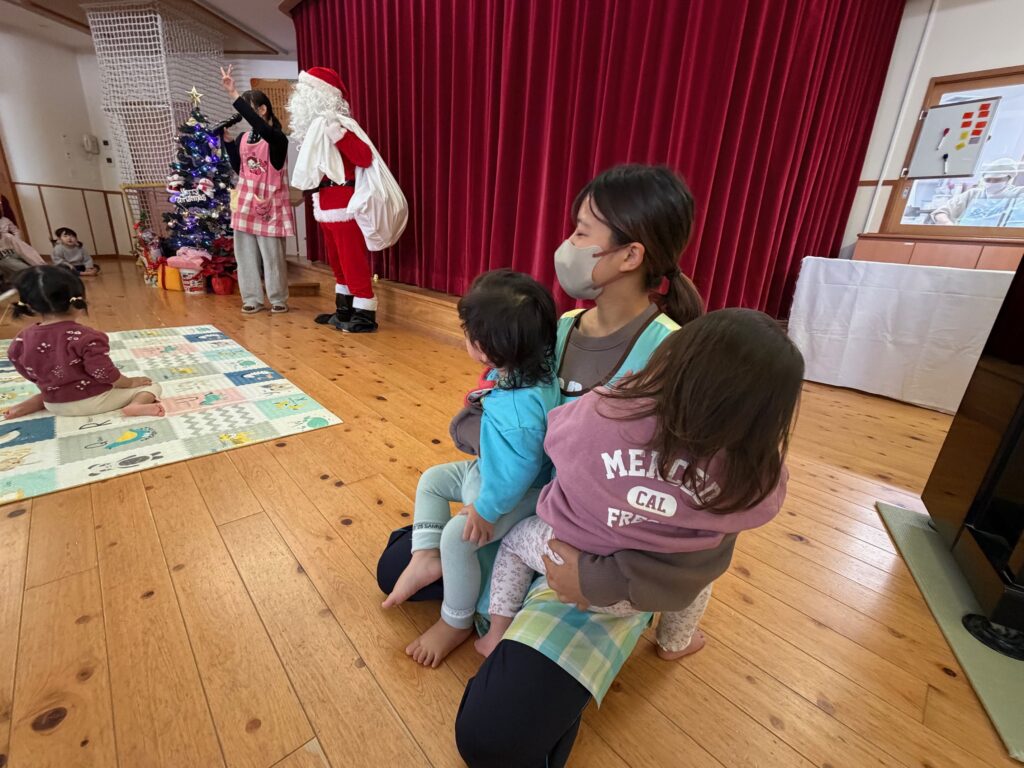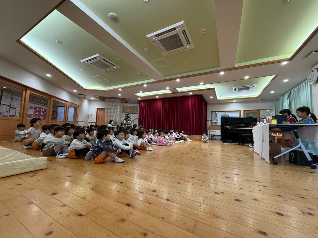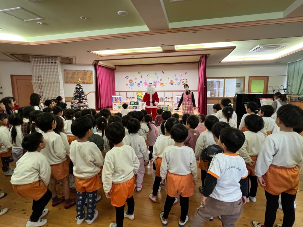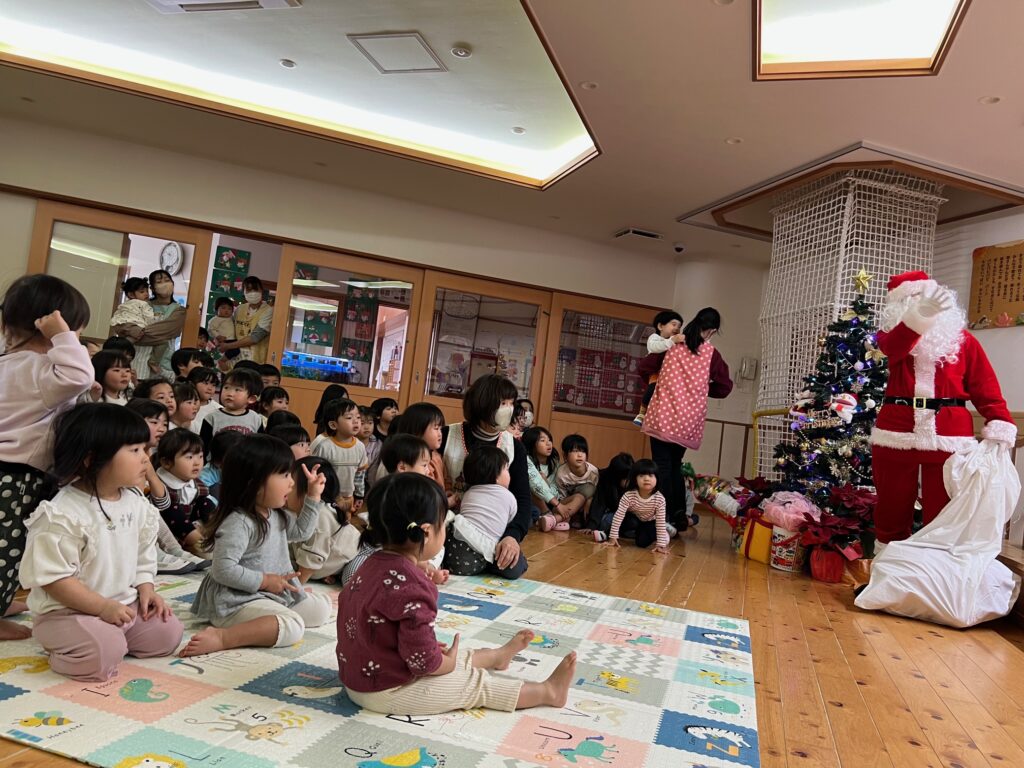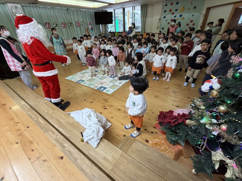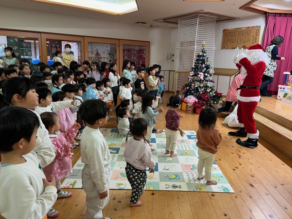 子ども達が待ちに待ったクリスマス会。先生達は「箱から出てくるマジック」を行いました。おひさま組は、ハンドベル奏を披露しました。 クリスマス由来の話もありました。 サンタさんの登場に興奮した子、びっくりした子など、様々な表情が見られました。 サンタさんからたくさんのプレゼントをもらいとてもうれしそうにプレゼントを眺め、午後からは早速プレゼントで遊ぶ子ども達でした。 クリスマス会