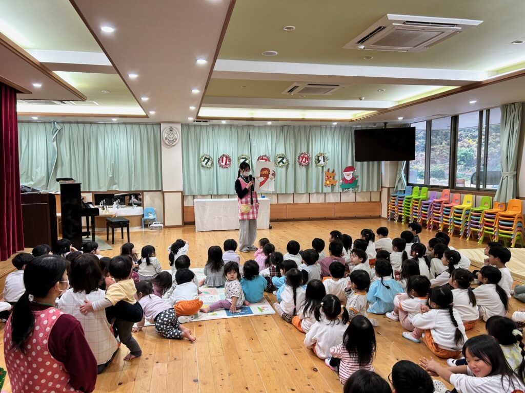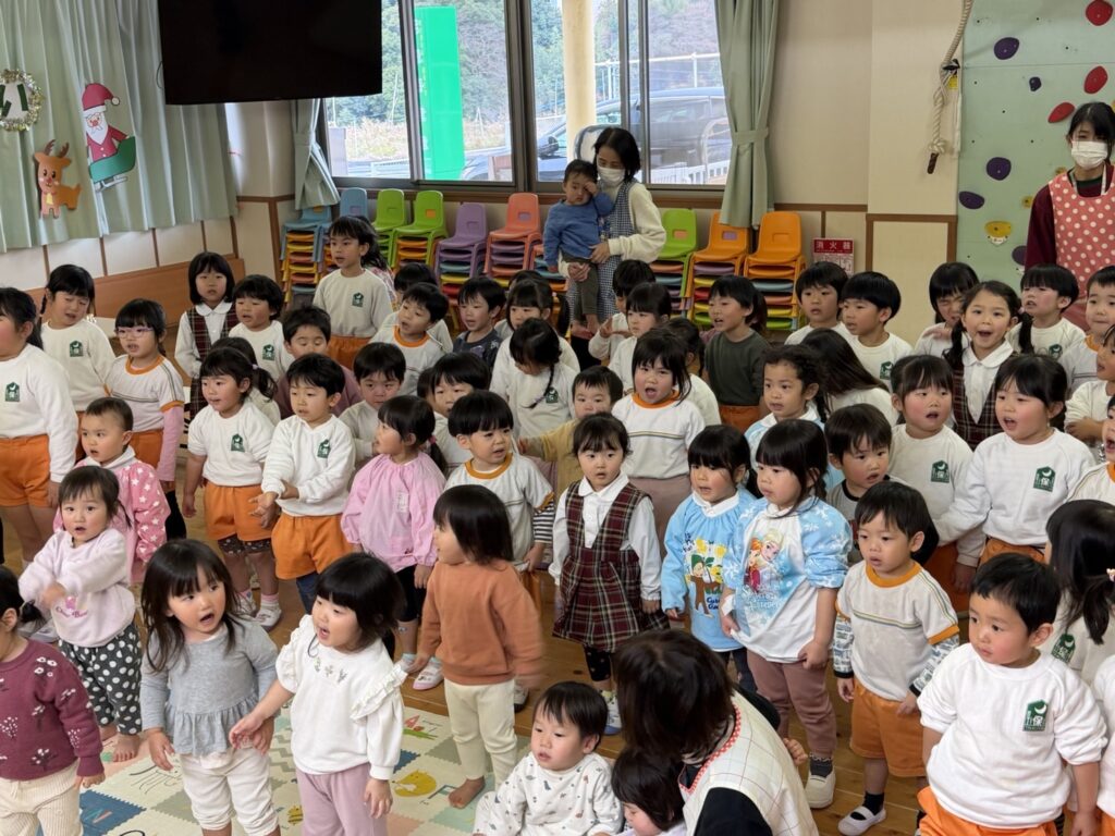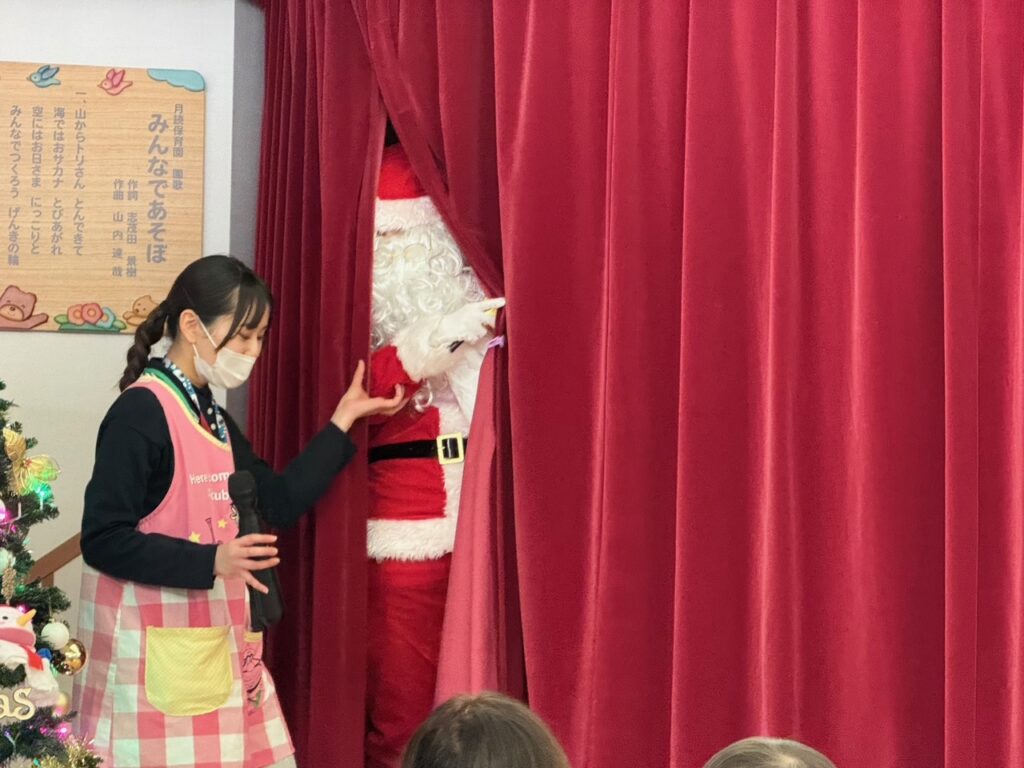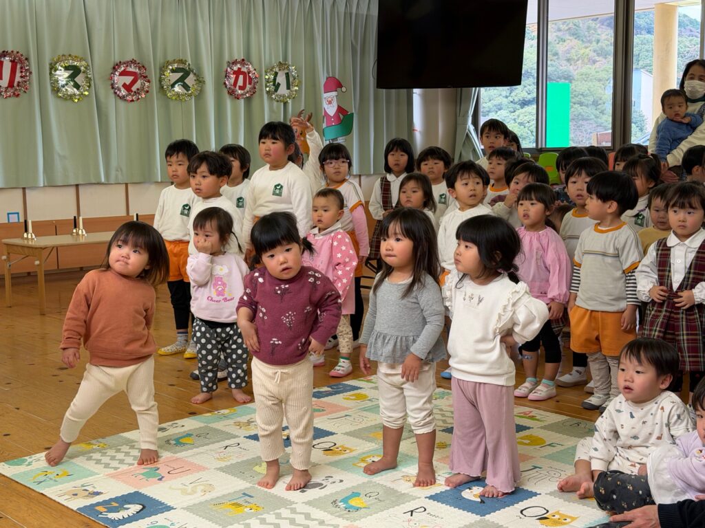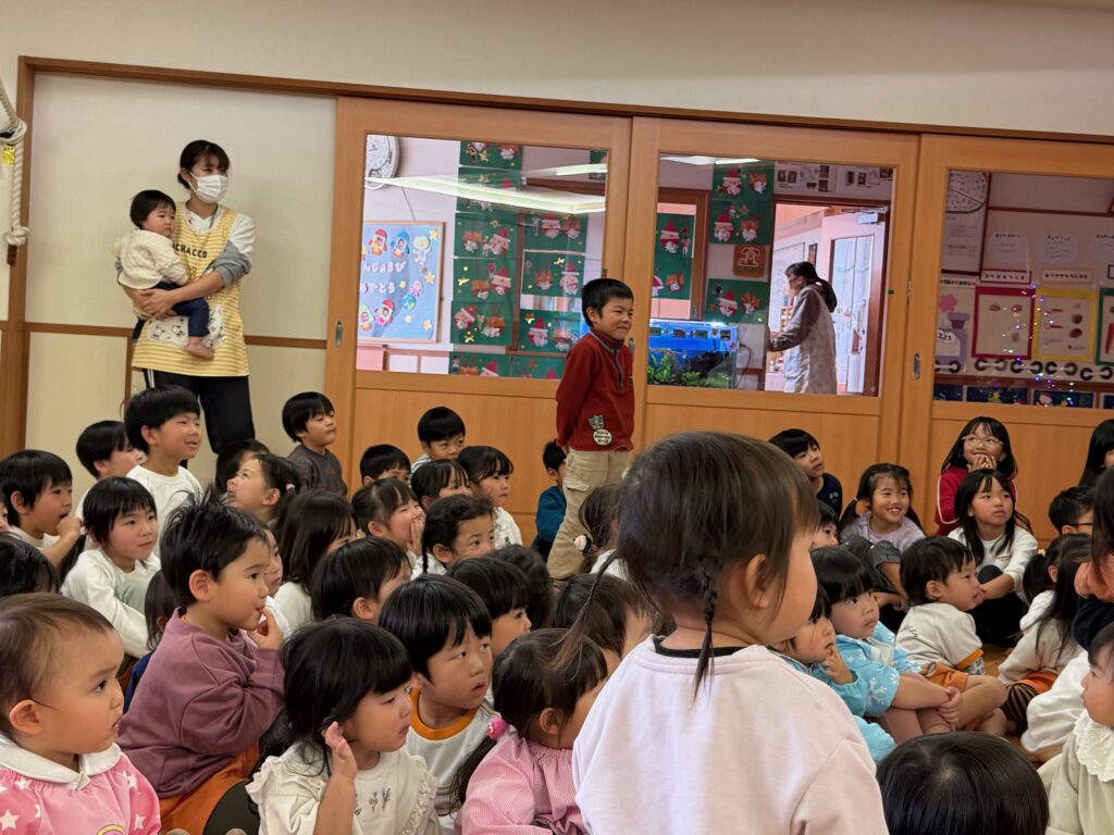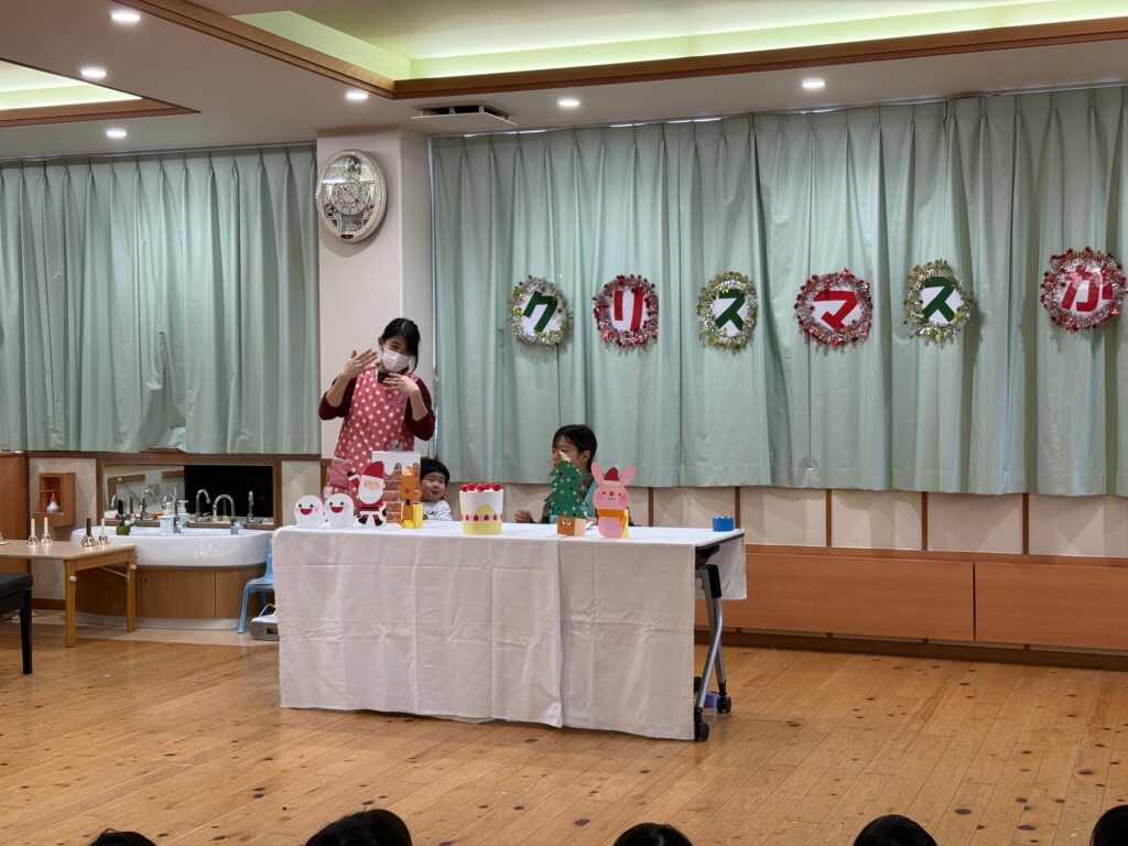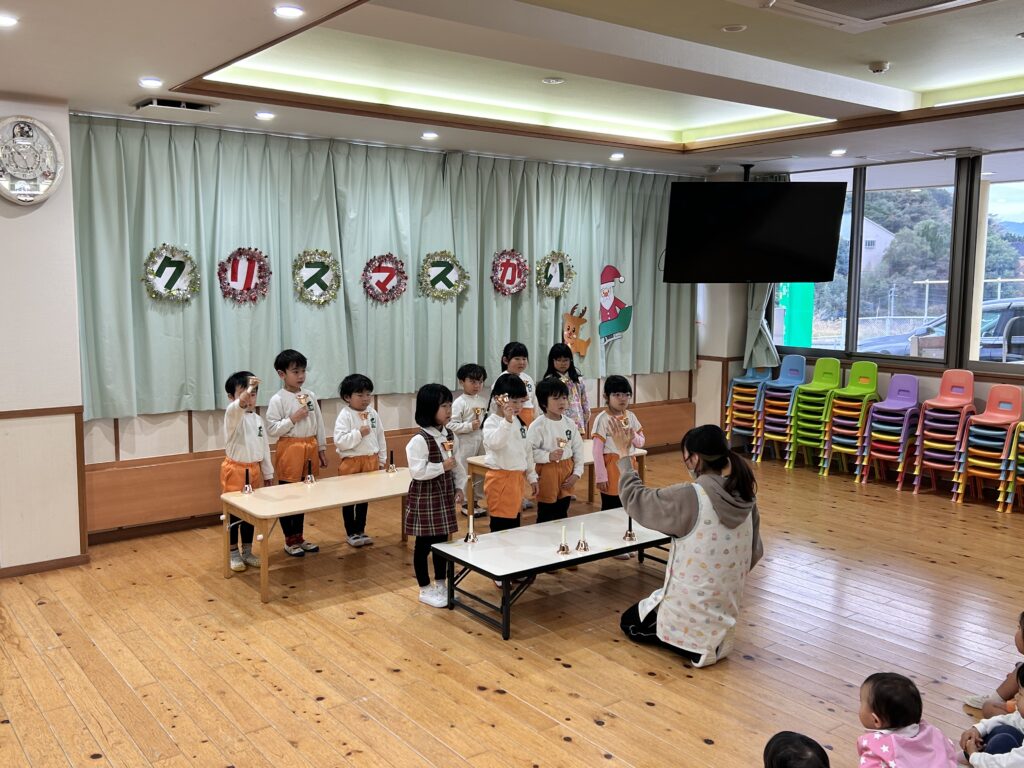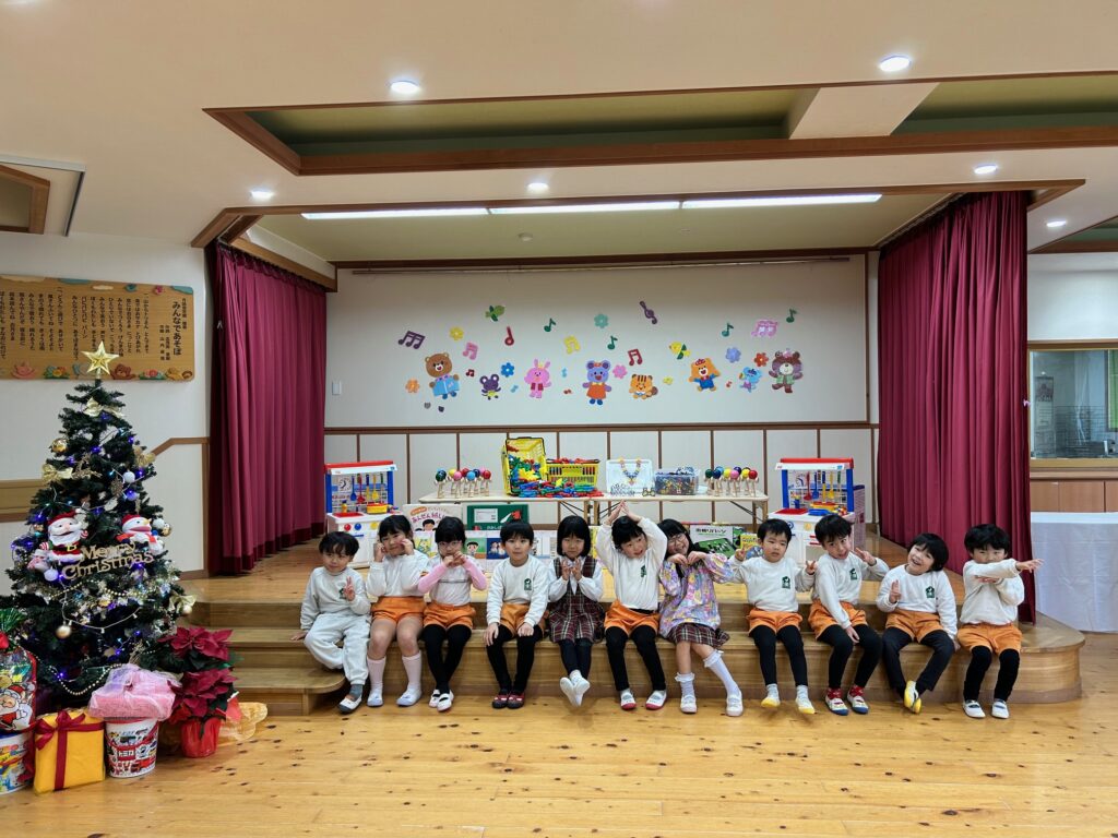 子ども達が待ちに待ったクリスマス会。先生達は「箱から出てくるマジック」を行いました。おひさま組は、ハンドベル奏を披露しました。 クリスマス由来の話もありました。 サンタさんの登場に興奮した子、びっくりした子など、様々な表情が見られました。 サンタさんからたくさんのプレゼントをもらいとてもうれしそうにプレゼントを眺め、午後からは早速プレゼントで遊ぶ子ども達でした。 クリスマス会