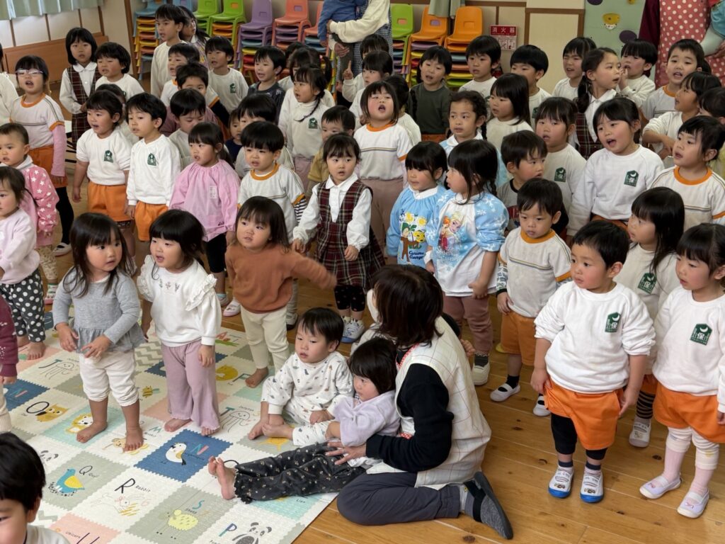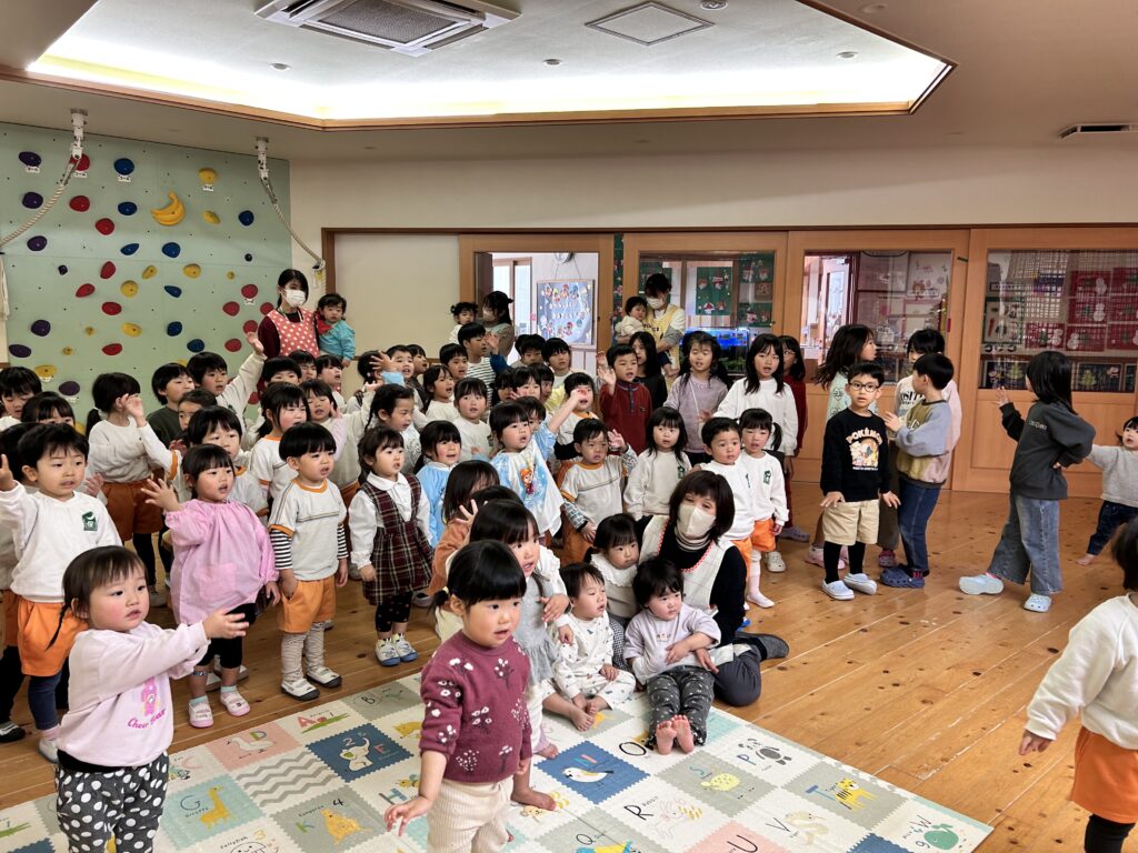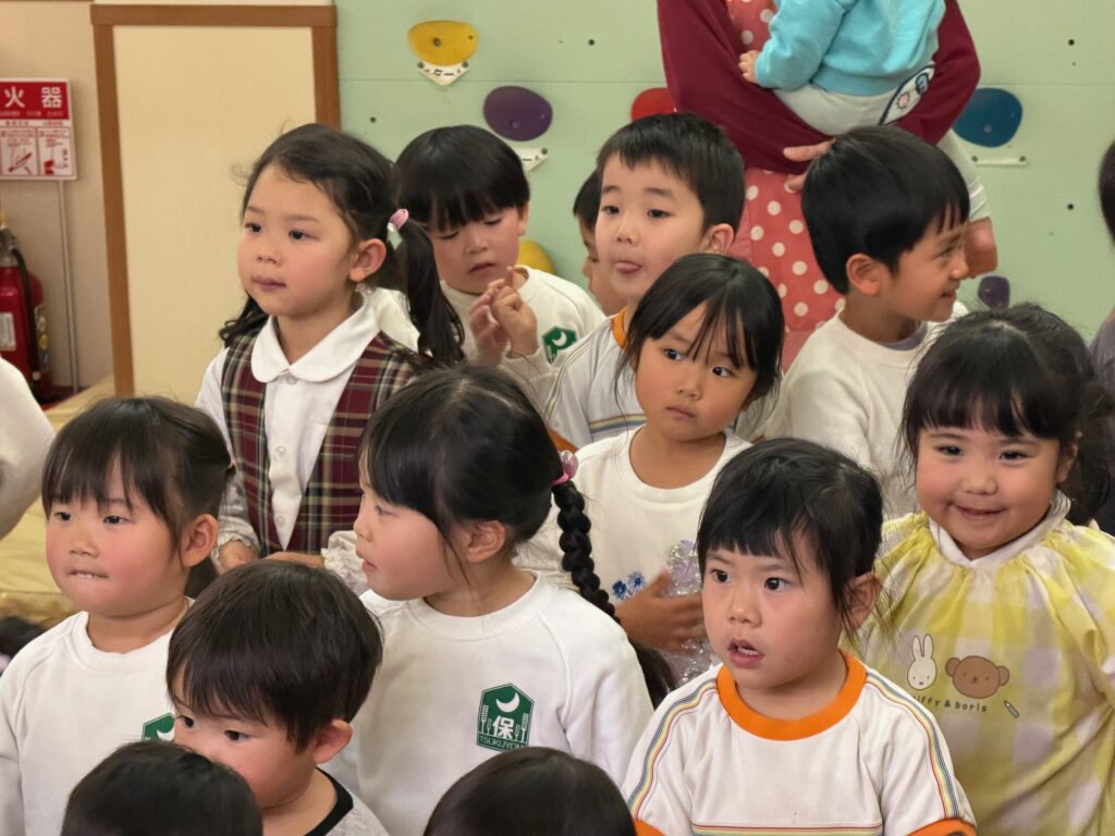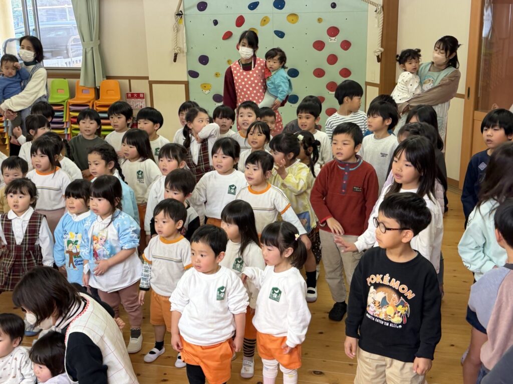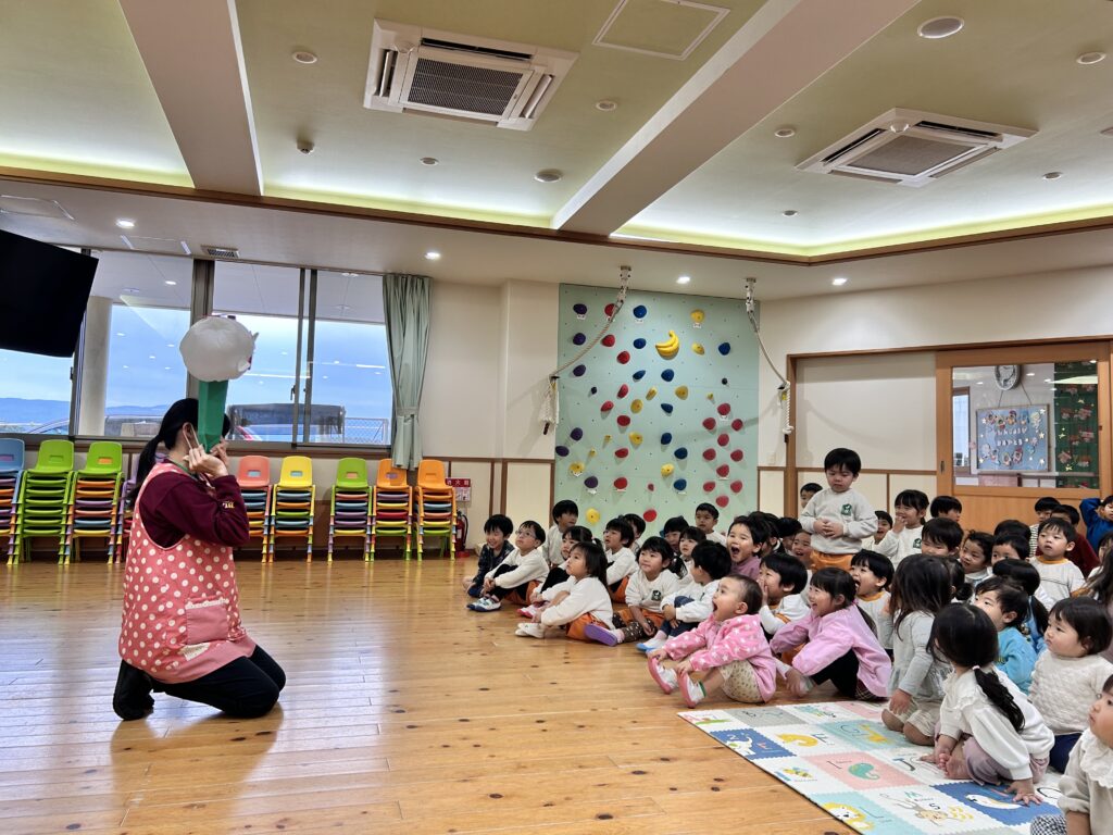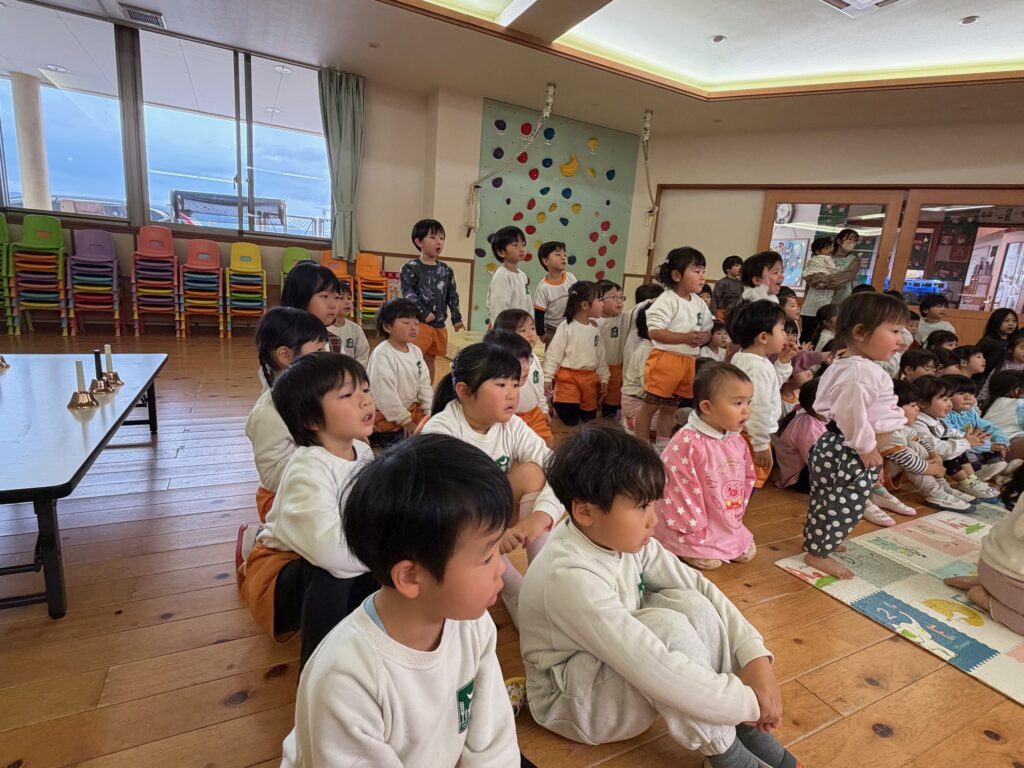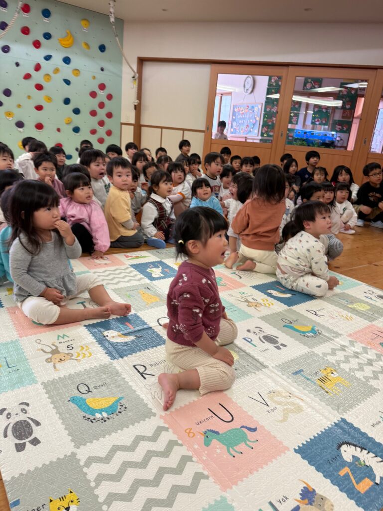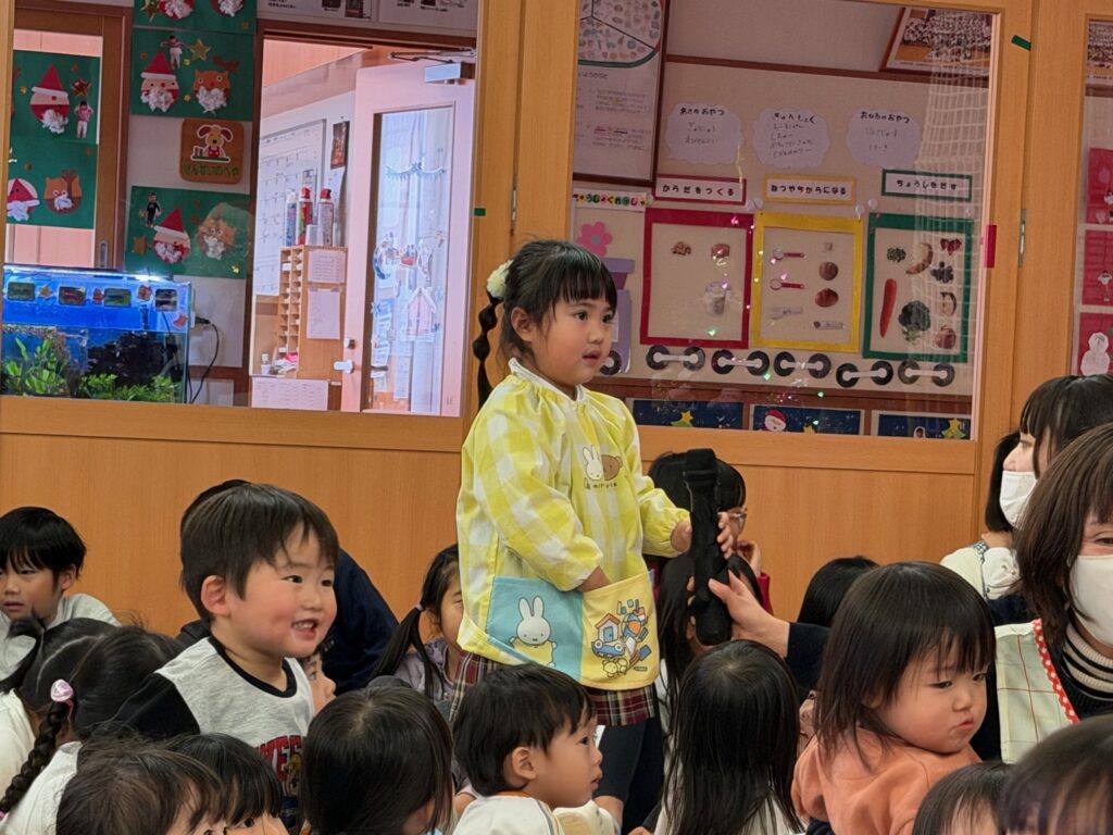 子ども達が待ちに待ったクリスマス会。先生達は「箱から出てくるマジック」を行いました。おひさま組は、ハンドベル奏を披露しました。 クリスマス由来の話もありました。 サンタさんの登場に興奮した子、びっくりした子など、様々な表情が見られました。 サンタさんからたくさんのプレゼントをもらいとてもうれしそうにプレゼントを眺め、午後からは早速プレゼントで遊ぶ子ども達でした。 クリスマス会