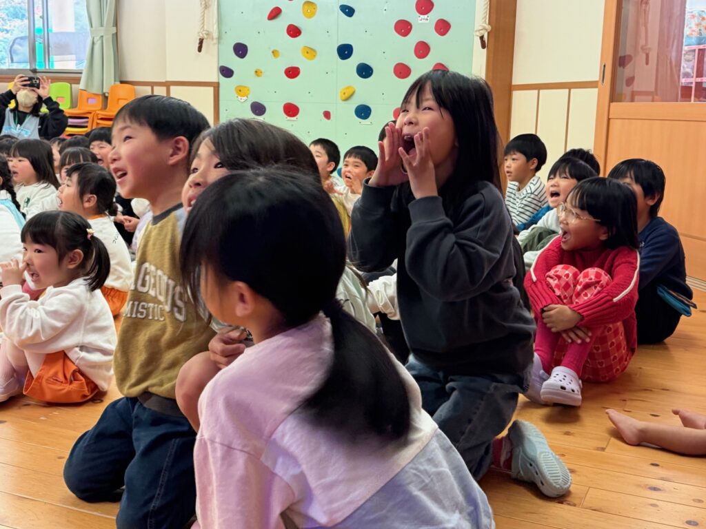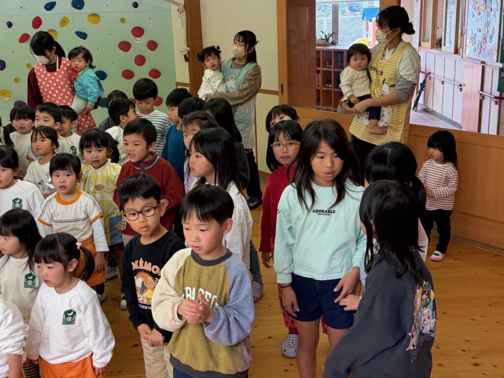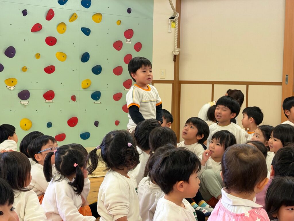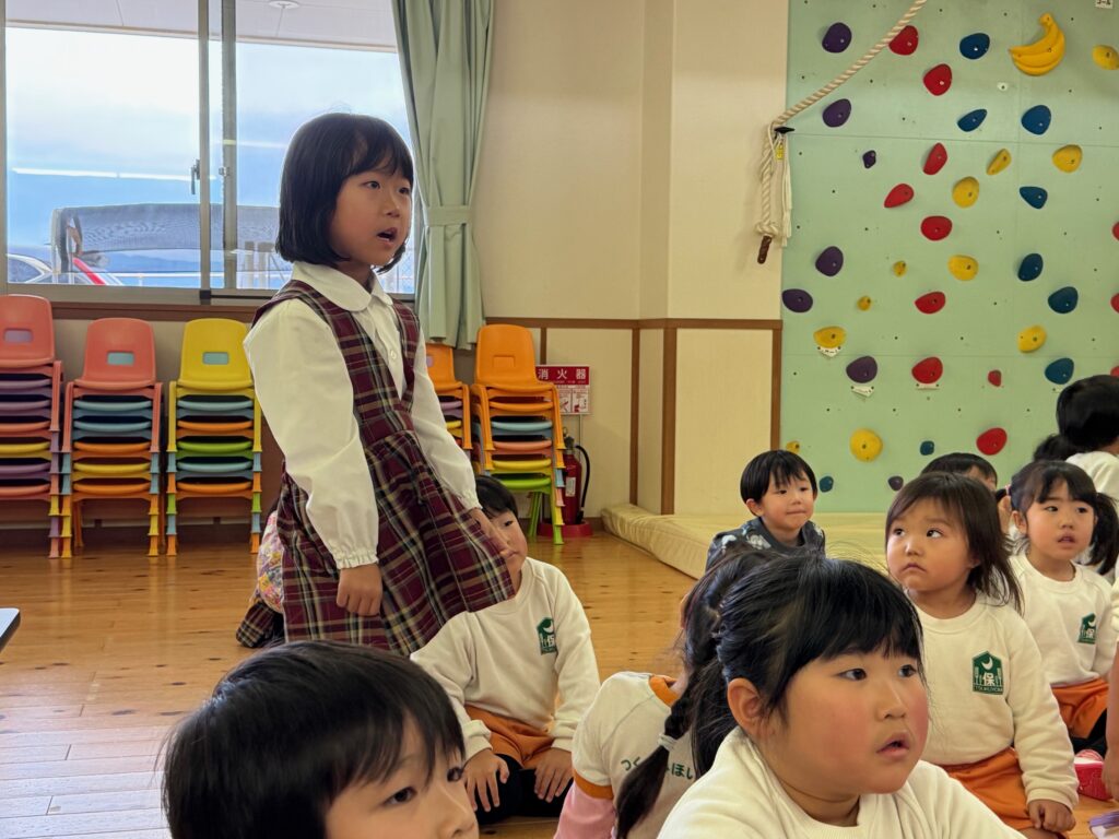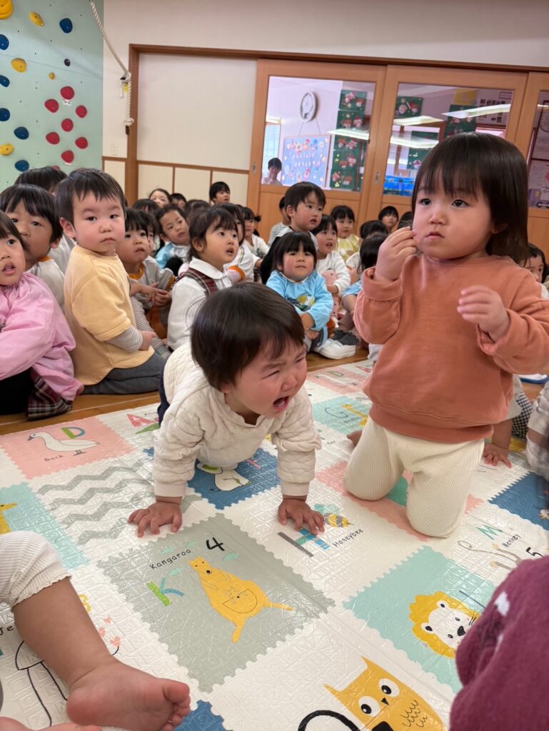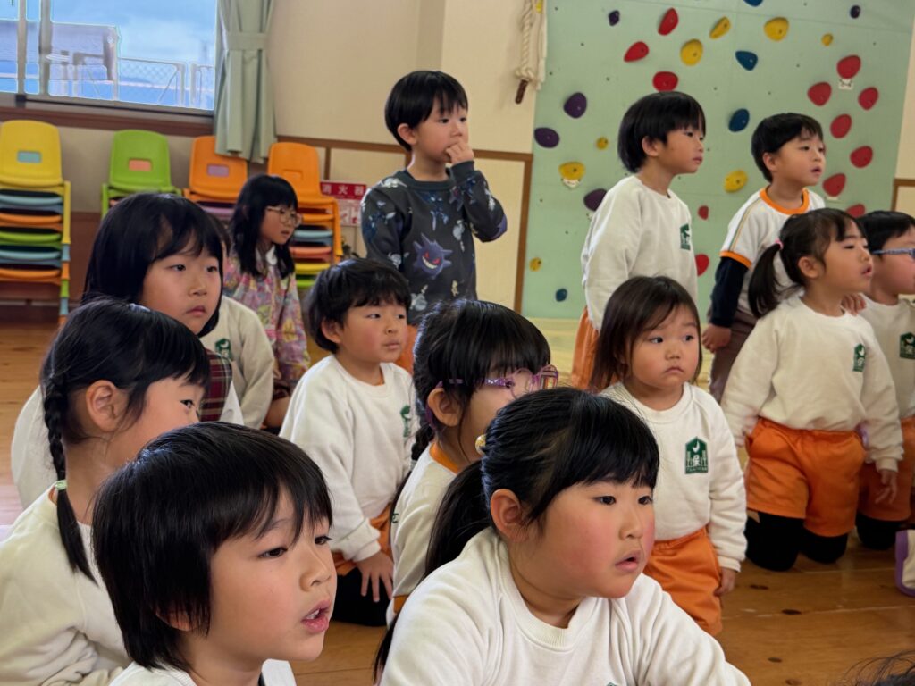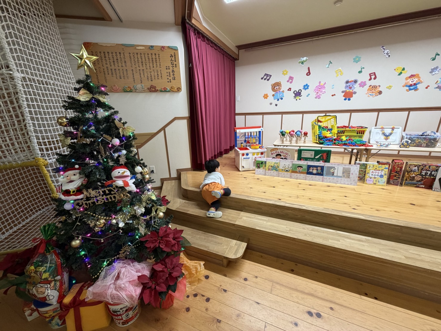 子ども達が待ちに待ったクリスマス会。先生達は「箱から出てくるマジック」を行いました。おひさま組は、ハンドベル奏を披露しました。 クリスマス由来の話もありました。 サンタさんの登場に興奮した子、びっくりした子など、様々な表情が見られました。 サンタさんからたくさんのプレゼントをもらいとてもうれしそうにプレゼントを眺め、午後からは早速プレゼントで遊ぶ子ども達でした。 クリスマス会