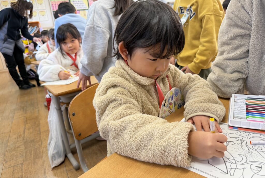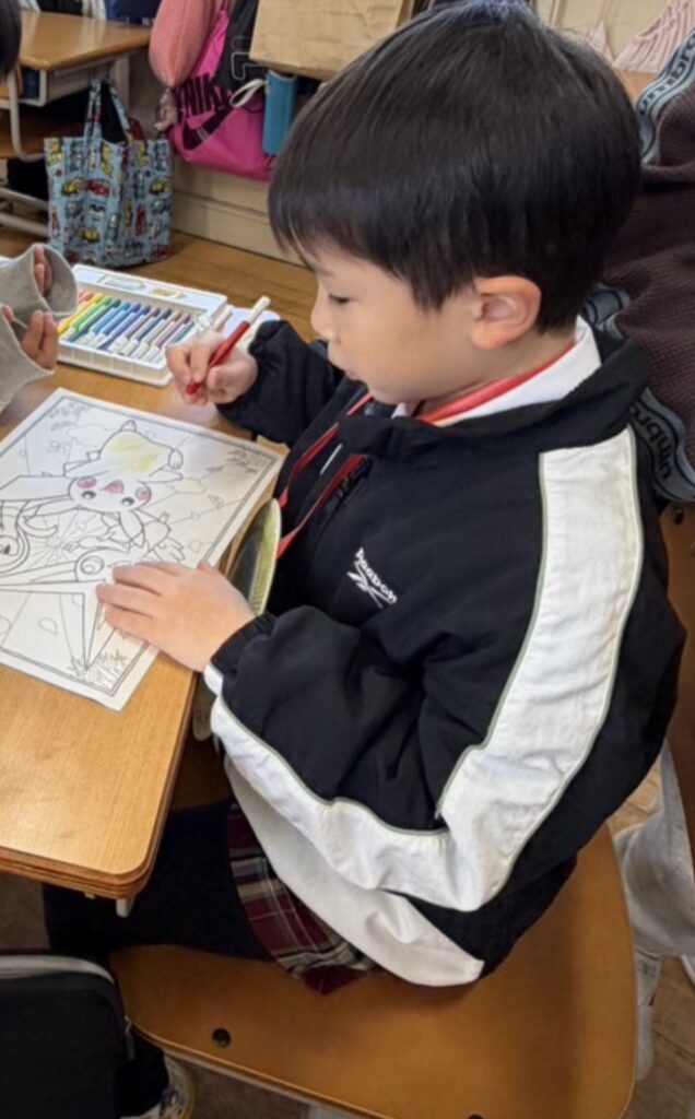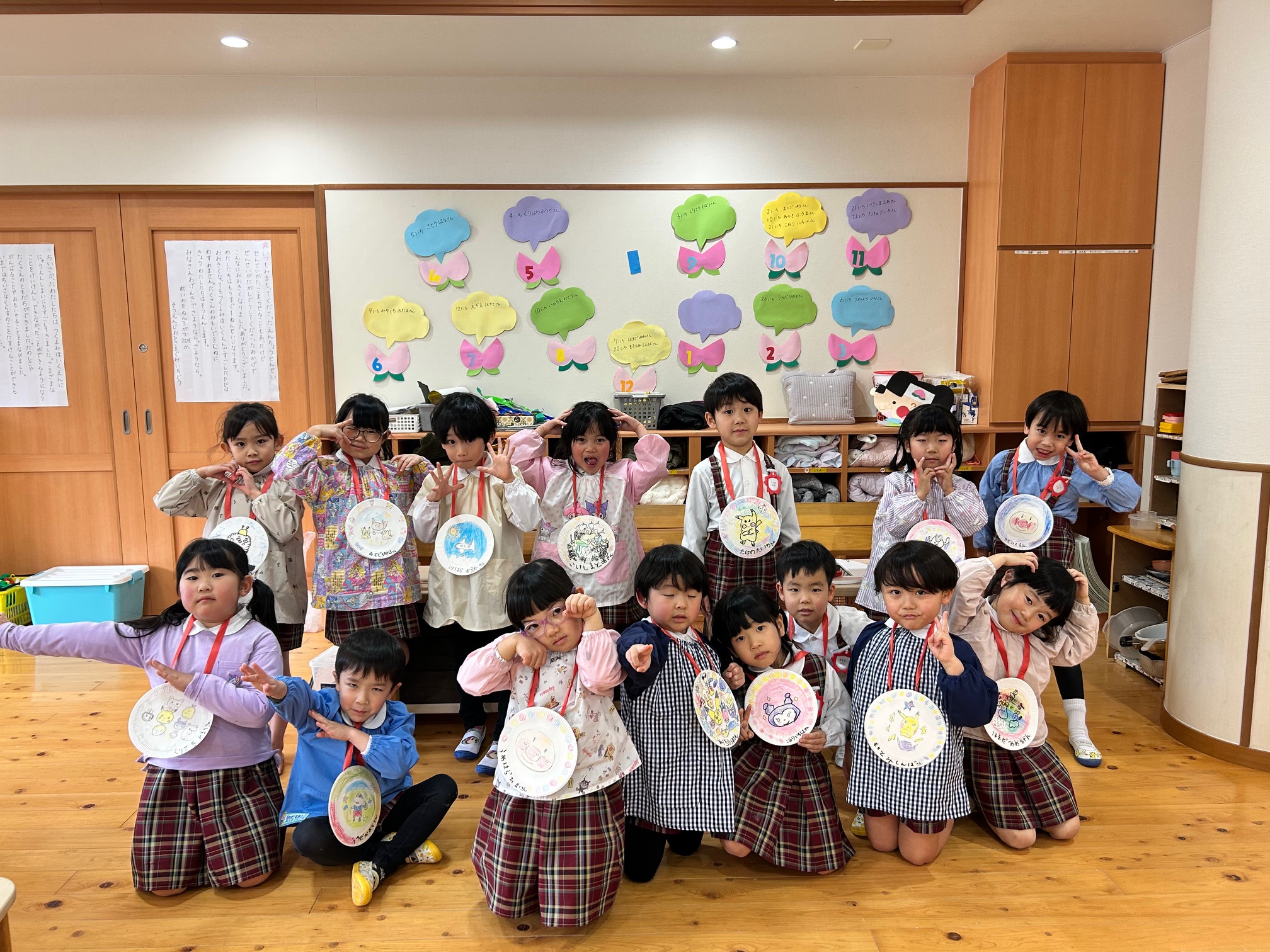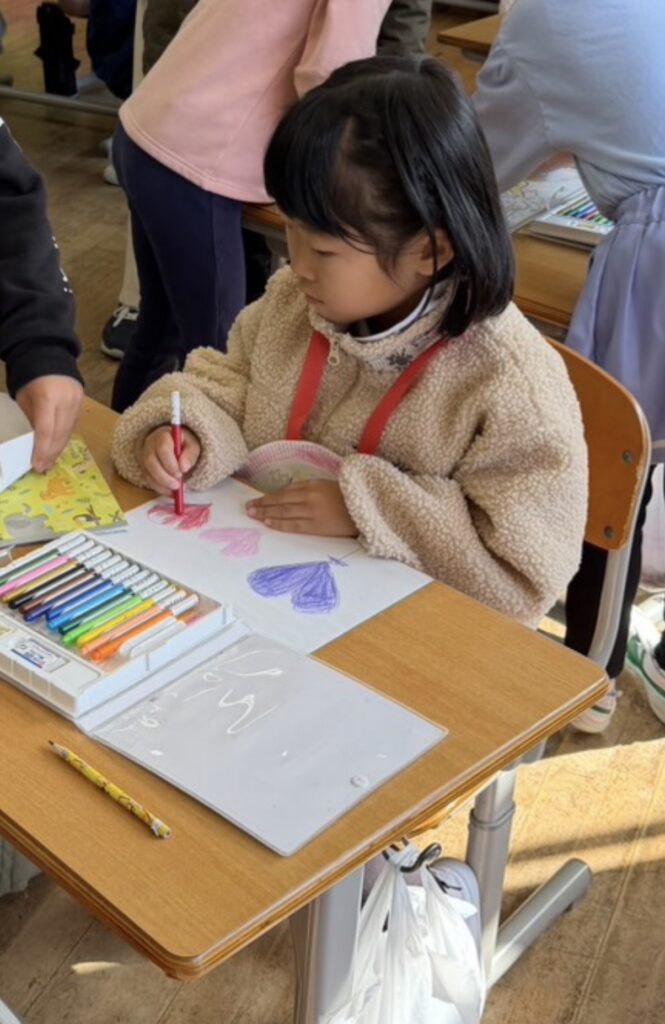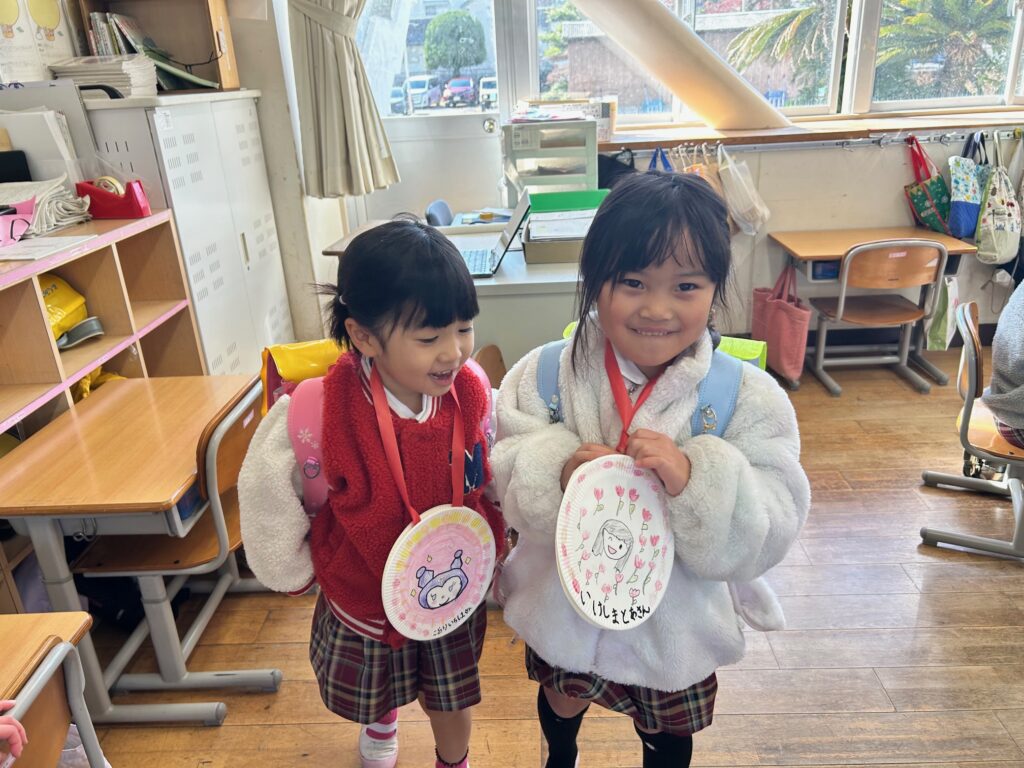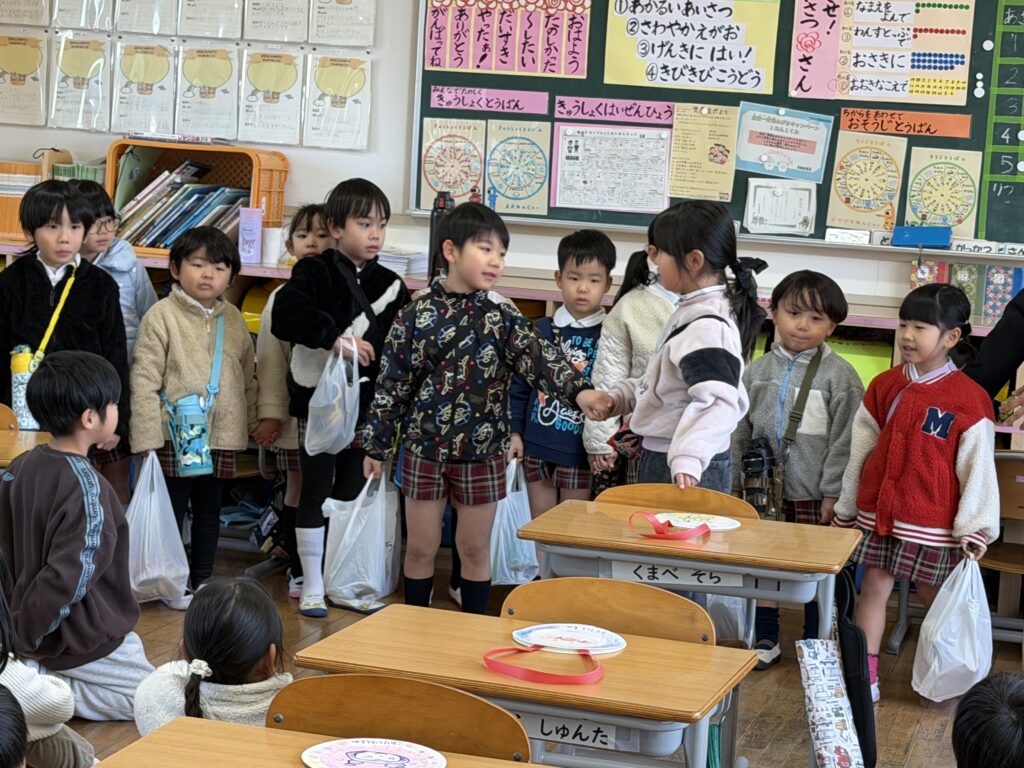 初めての1年生の教室。ドキドキして少し緊張気味です。ペアになって交流活動を行いました。 1人ずつメダルをかけてもらいました。 机でぬりえ・お絵かき体験 ランドセルを背負わせてもらいました。嬉しいね 小学校ではパソコンも使います。 体育館・図書室の見学も行いました。 体育館の倉庫には色々な道具がありました。 帰りのあいさつ 栽培中の立派なブロッコリーがありました。 校庭を使わせていただきました。広い運動場を走って気持ち良かったね。 シーソー上手に乗れたよ! 大きい遊具でハイポーズ!小学校って楽しいね! 小学校へまた行きたい!という声がたくさん聞かれました。お礼の手紙を書いています。また小学校に行って1年1組の皆さんに渡す予定です。 2025 2025年度一覧② 時津北小学校との交流会(おひさま組)