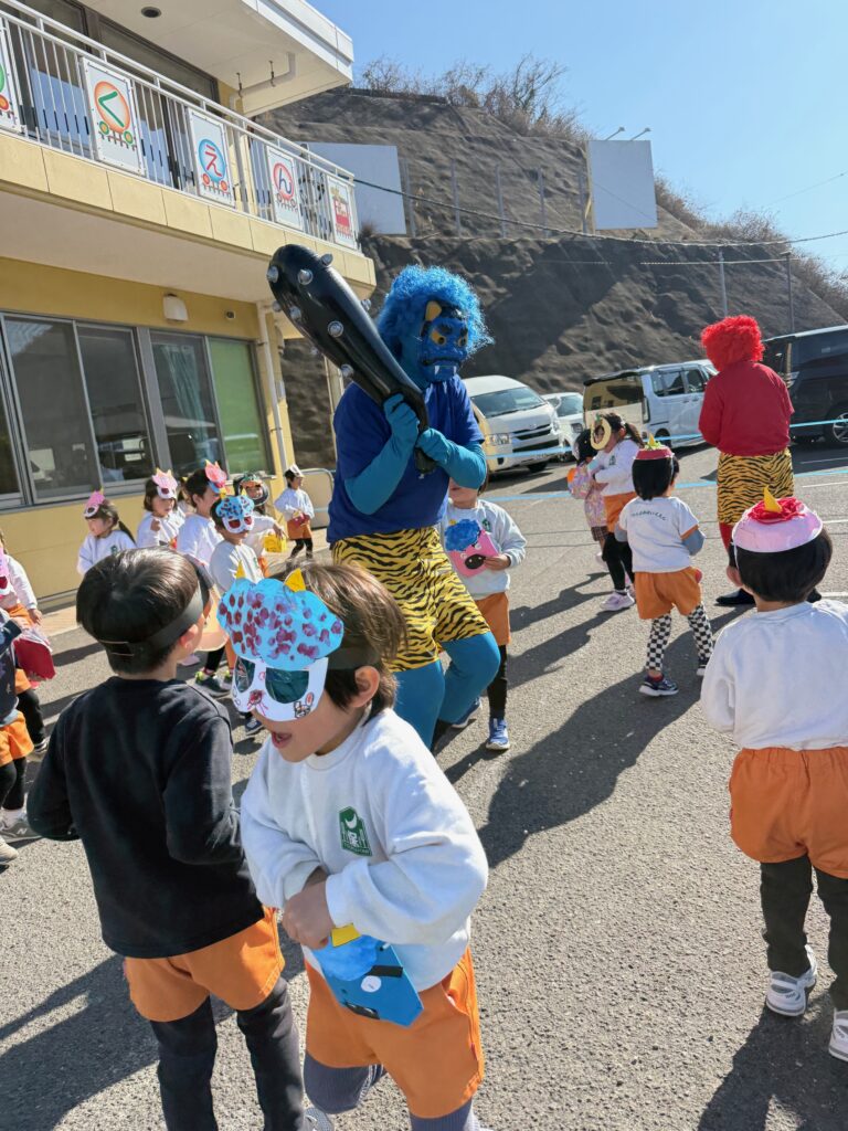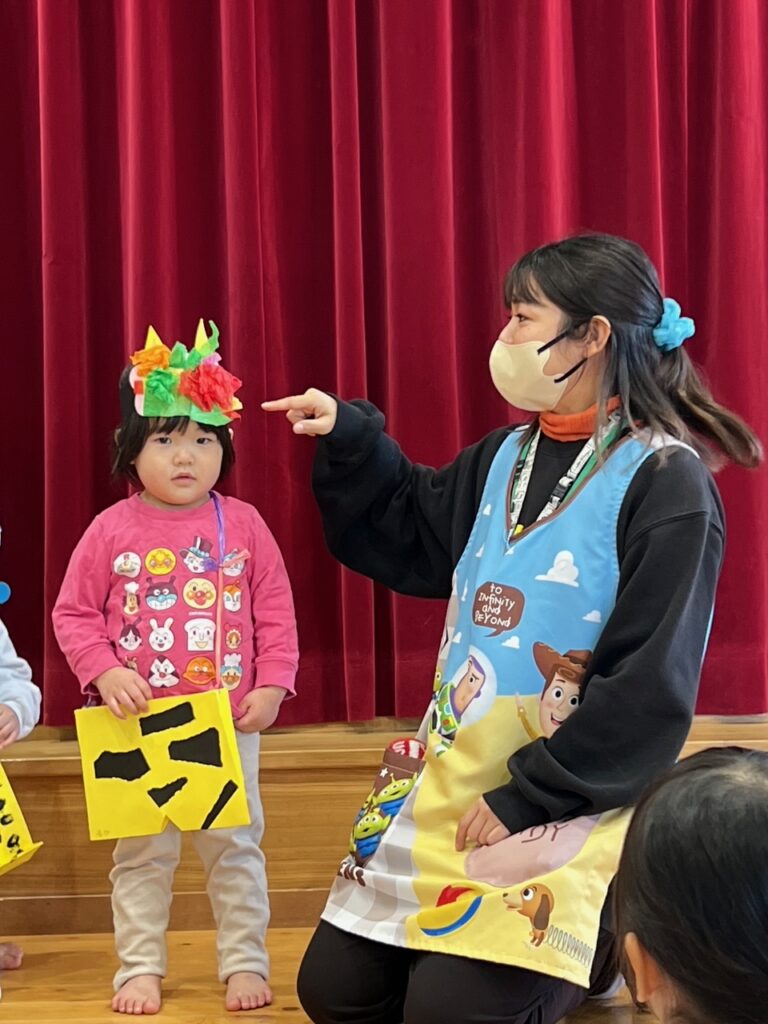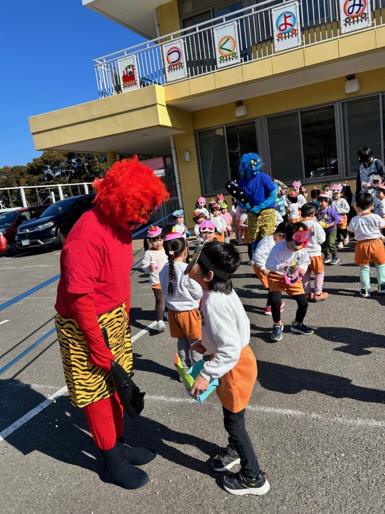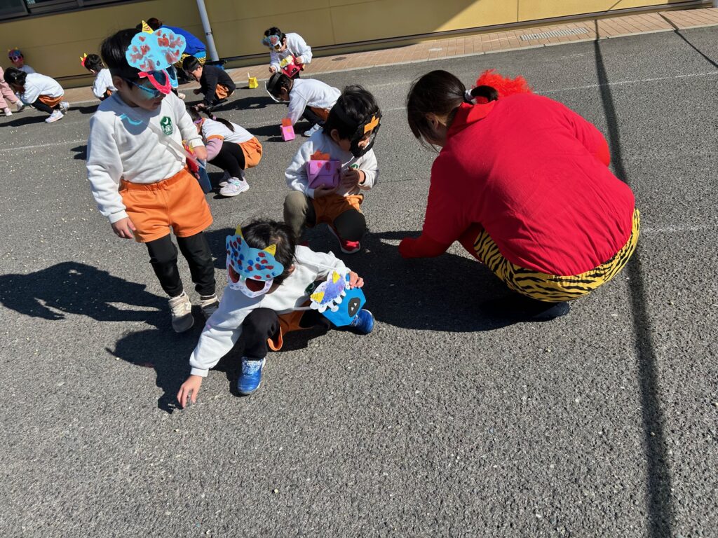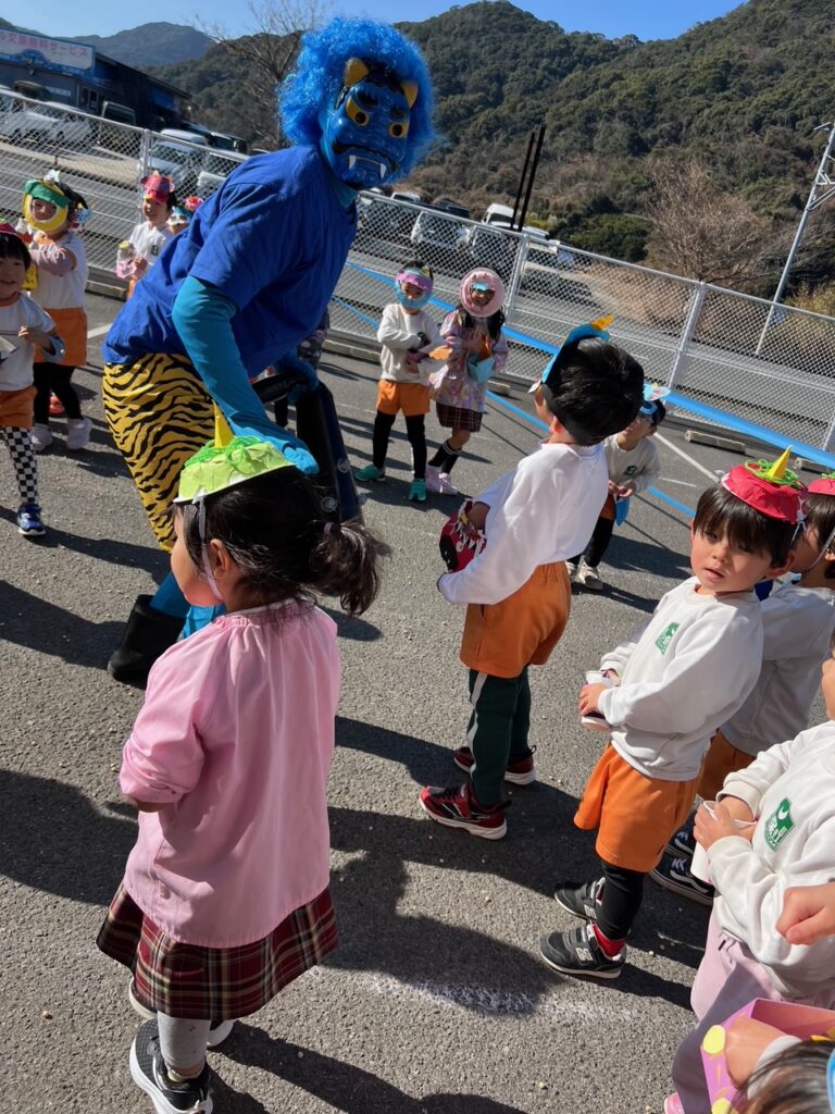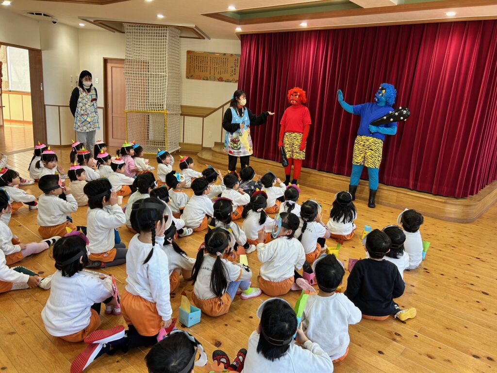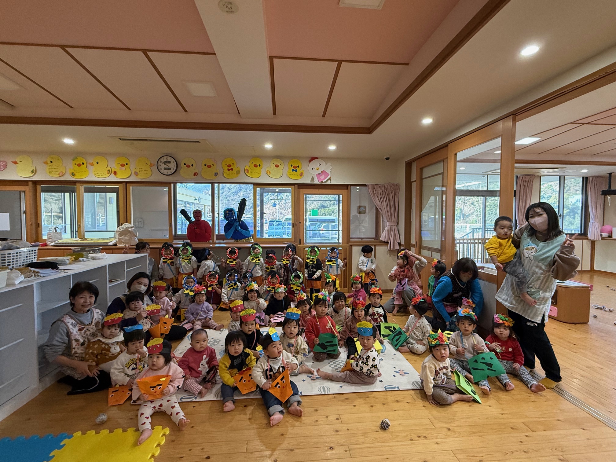 鬼と一緒に写真を撮りました。 つき、ほし、そよかぜ組は、新聞豆を使って鬼退治をしました。 節分の集い 本日の鬼を紹介しました! 鬼の正体は…青鬼(伊倉先生)・赤鬼(筧先生)でした。 鬼も一緒に豆拾いをしました。 つき組(鬼の顔のシールを貼り枡を作りました。クレヨンを使って鬼のお面を作りました。) ほし組(折り紙をちぎって鬼のパンツの枡を作りました。お面は花紙を使って作りました。) そよかぜ組(枡は、絵の具で模様を付けました。お面は貼り絵をしました。) にじ組(枡は折り紙を使って鬼を折って作りました。貼り絵をして鬼の帽子を作りました。) そら組(枡は、画用紙を使って鬼の顔を作りました。お面は、カラーセロハンを使って鬼のメガネを作りました。) おひさま組(枡は画用紙を折りつくりました。お面は、自分の顔の大きさに切り抜いて貼り絵をしました。) 2025 2025年度一覧② 節分の集い