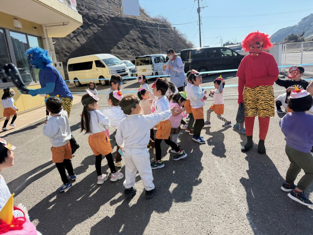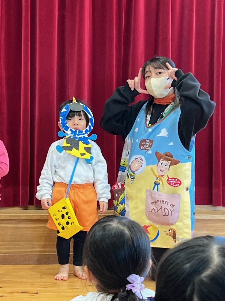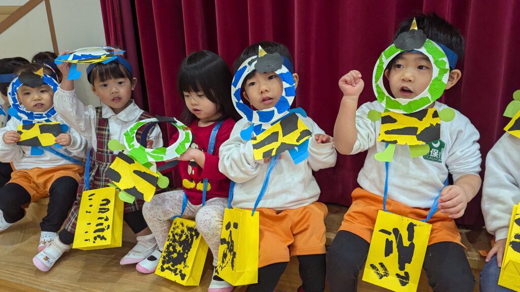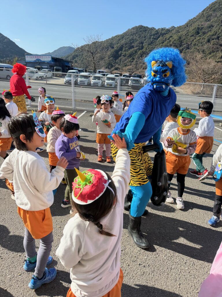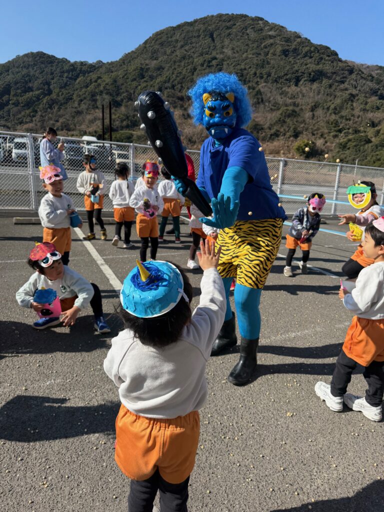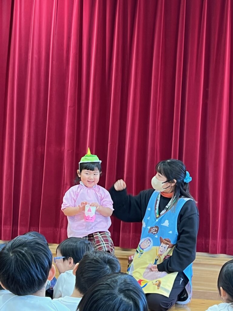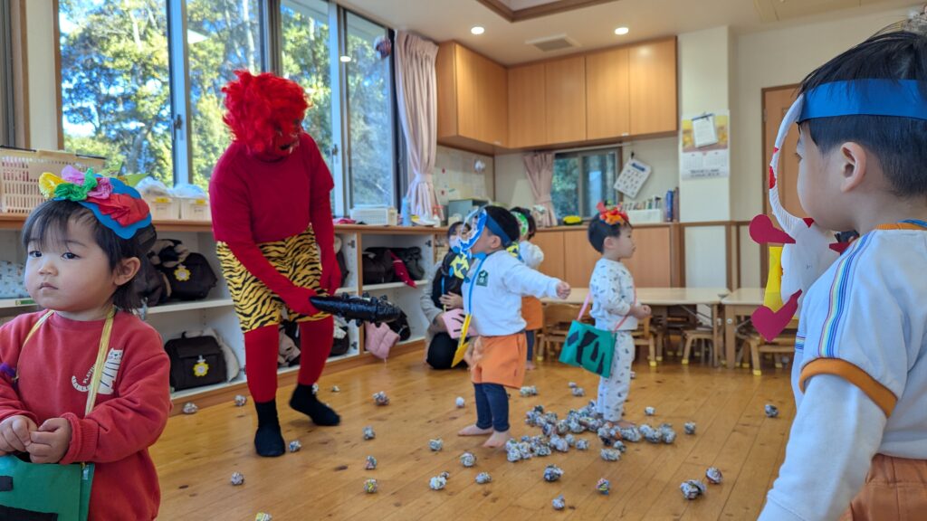 鬼と一緒に写真を撮りました。 つき、ほし、そよかぜ組は、新聞豆を使って鬼退治をしました。 節分の集い 本日の鬼を紹介しました! 鬼の正体は…青鬼(伊倉先生)・赤鬼(筧先生)でした。 鬼も一緒に豆拾いをしました。 つき組(鬼の顔のシールを貼り枡を作りました。クレヨンを使って鬼のお面を作りました。) ほし組(折り紙をちぎって鬼のパンツの枡を作りました。お面は花紙を使って作りました。) そよかぜ組(枡は、絵の具で模様を付けました。お面は貼り絵をしました。) にじ組(枡は折り紙を使って鬼を折って作りました。貼り絵をして鬼の帽子を作りました。) そら組(枡は、画用紙を使って鬼の顔を作りました。お面は、カラーセロハンを使って鬼のメガネを作りました。) おひさま組(枡は画用紙を折りつくりました。お面は、自分の顔の大きさに切り抜いて貼り絵をしました。) 2025 2025年度一覧② 節分の集い
