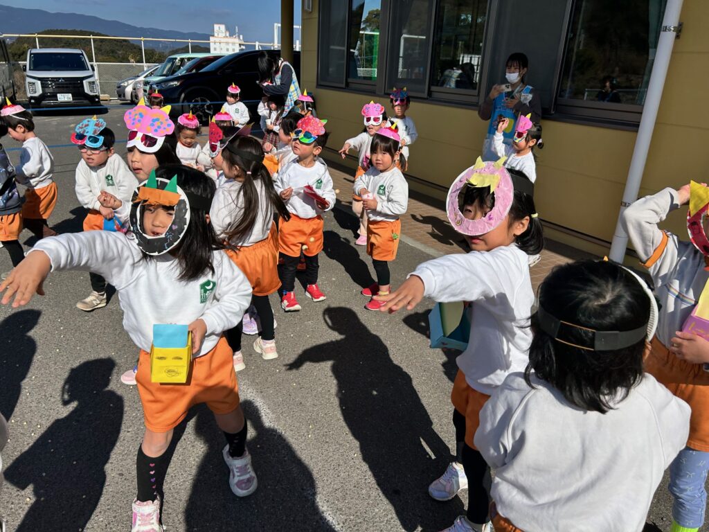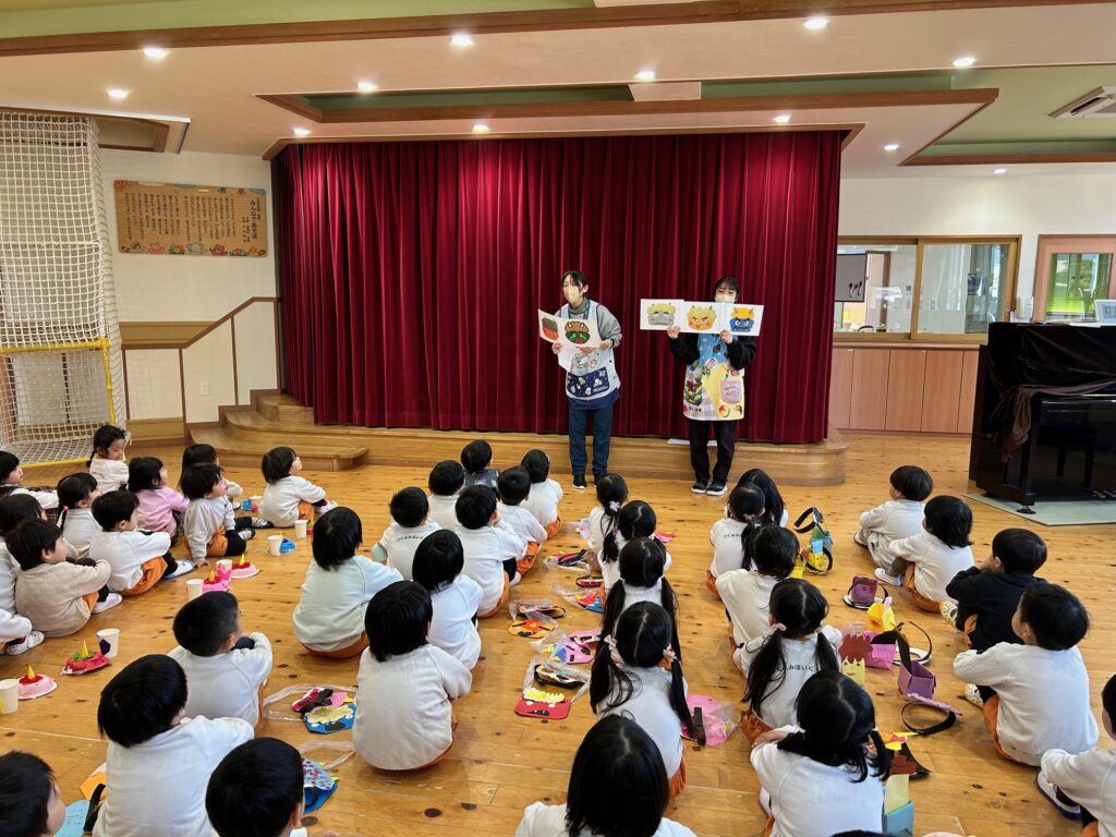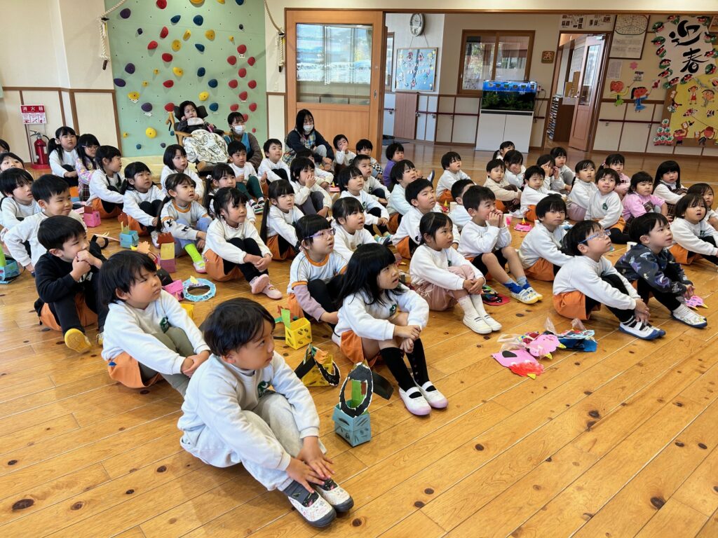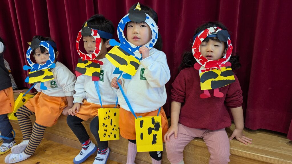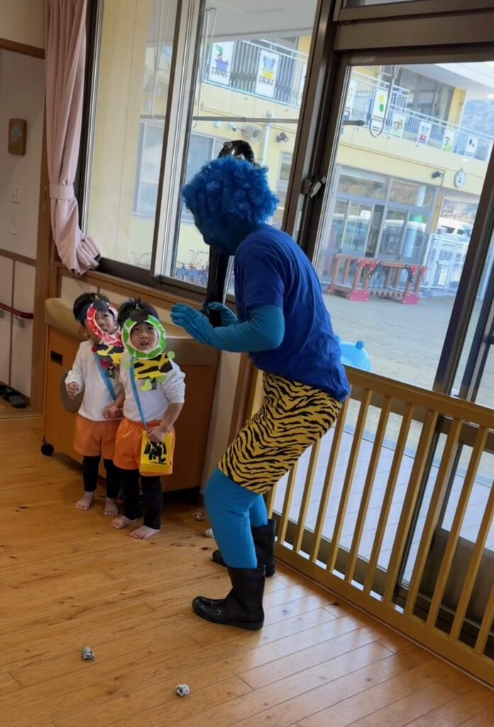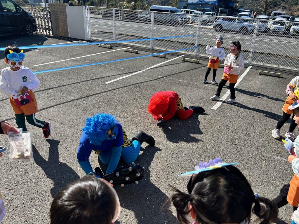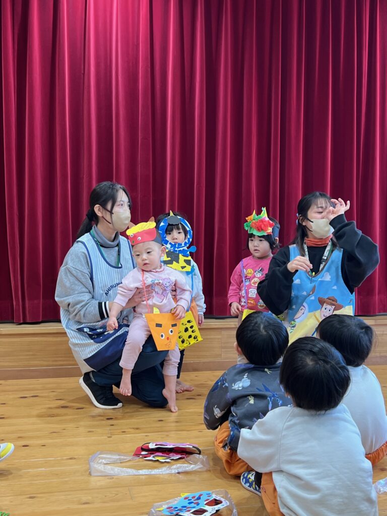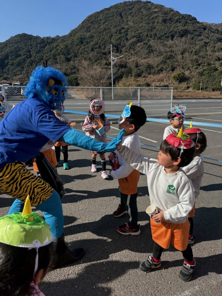 鬼と一緒に写真を撮りました。 つき、ほし、そよかぜ組は、新聞豆を使って鬼退治をしました。 節分の集い 本日の鬼を紹介しました! 鬼の正体は…青鬼(伊倉先生)・赤鬼(筧先生)でした。 鬼も一緒に豆拾いをしました。 つき組(鬼の顔のシールを貼り枡を作りました。クレヨンを使って鬼のお面を作りました。) ほし組(折り紙をちぎって鬼のパンツの枡を作りました。お面は花紙を使って作りました。) そよかぜ組(枡は、絵の具で模様を付けました。お面は貼り絵をしました。) にじ組(枡は折り紙を使って鬼を折って作りました。貼り絵をして鬼の帽子を作りました。) そら組(枡は、画用紙を使って鬼の顔を作りました。お面は、カラーセロハンを使って鬼のメガネを作りました。) おひさま組(枡は画用紙を折りつくりました。お面は、自分の顔の大きさに切り抜いて貼り絵をしました。) 2025 2025年度一覧② 節分の集い