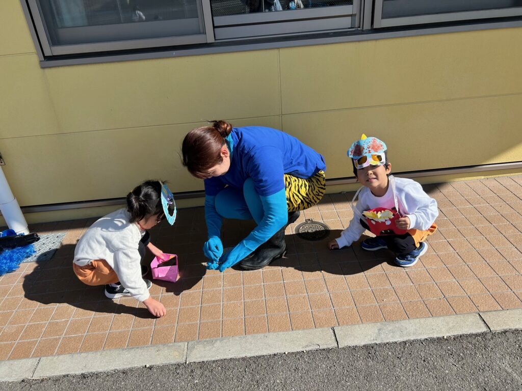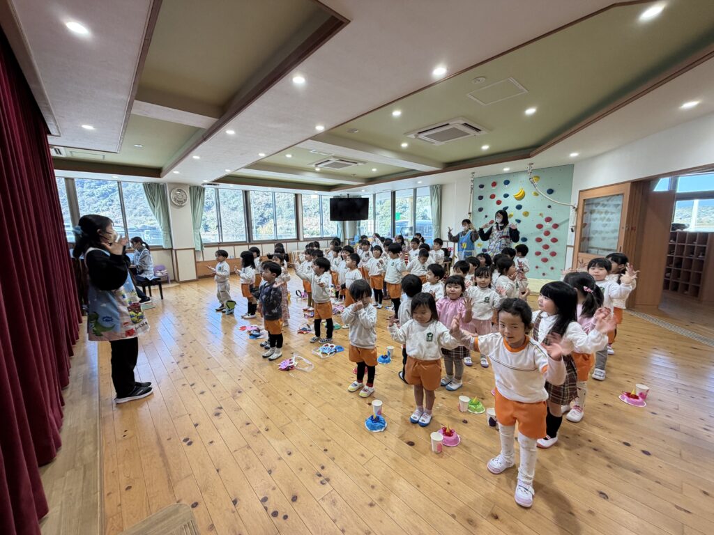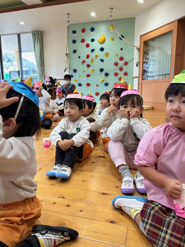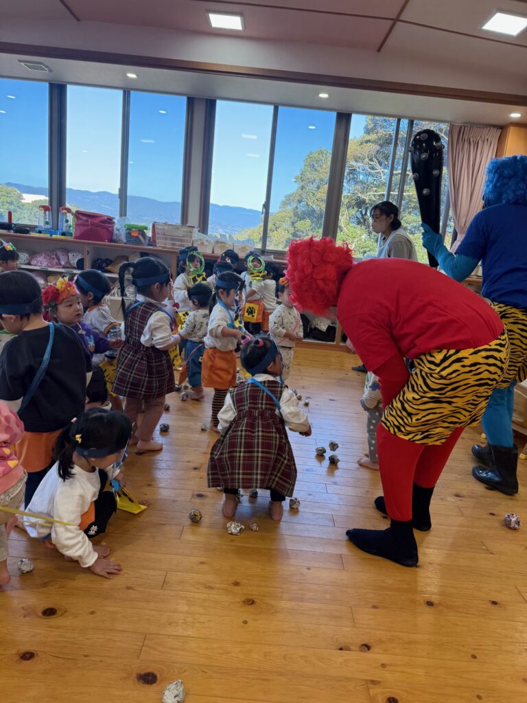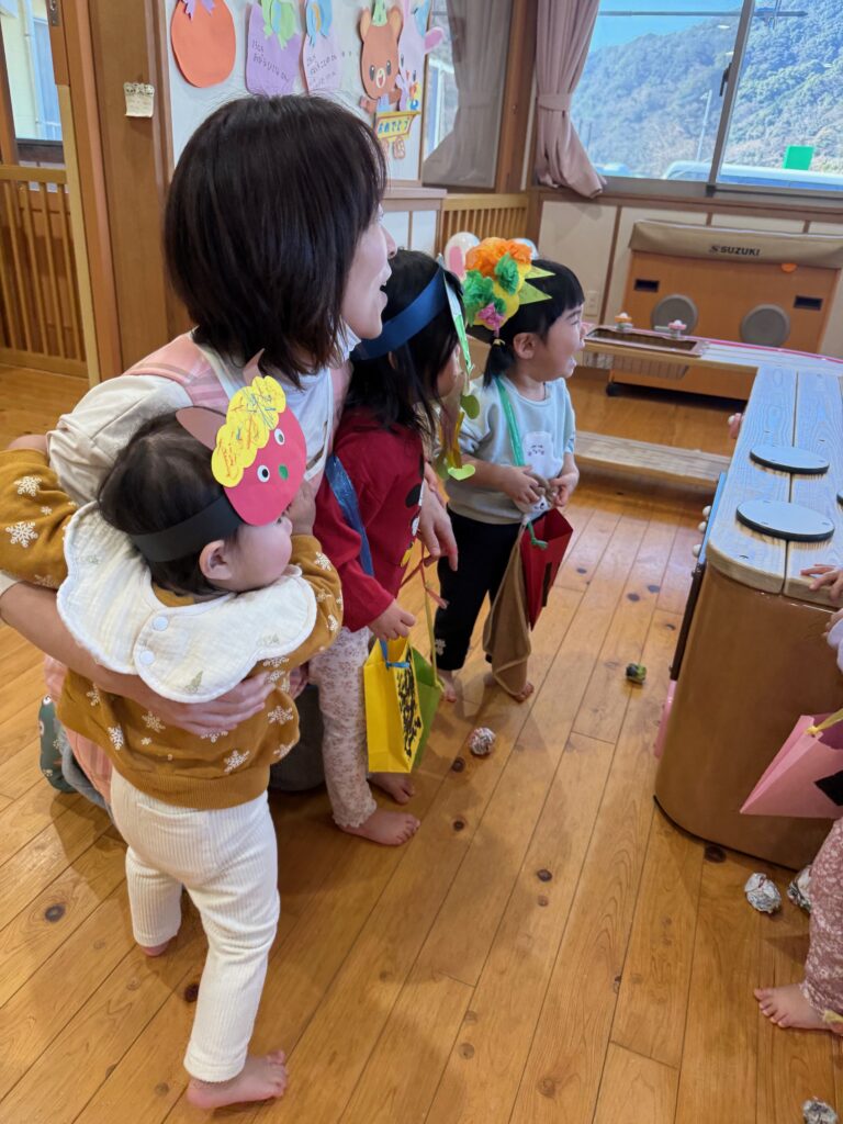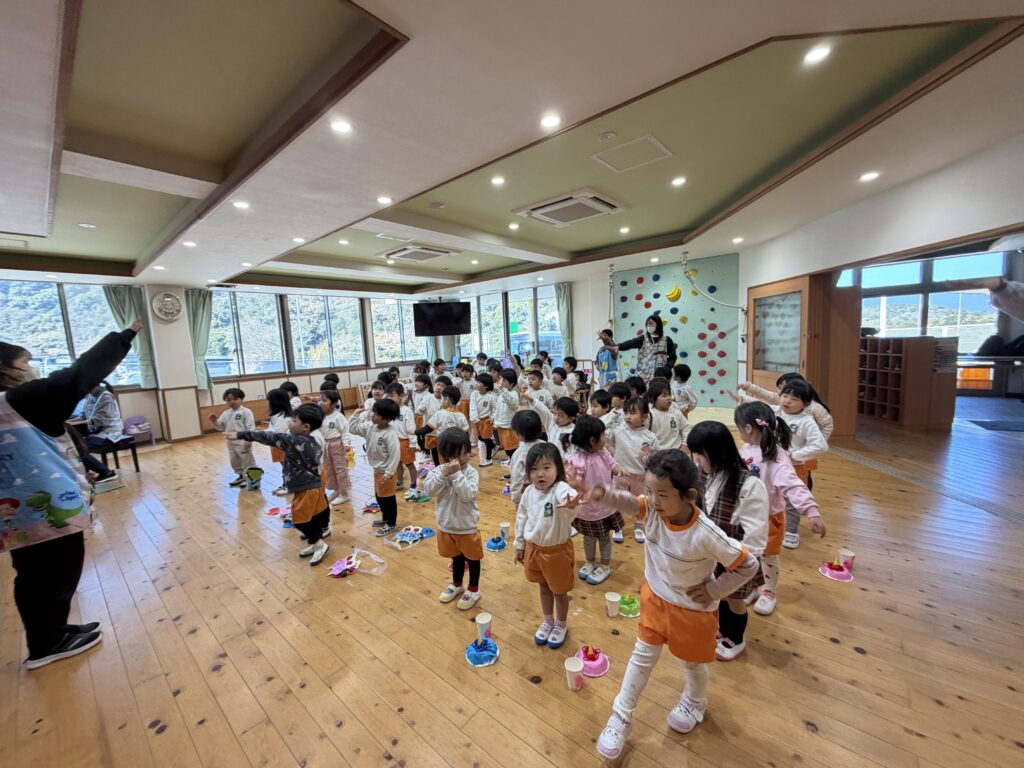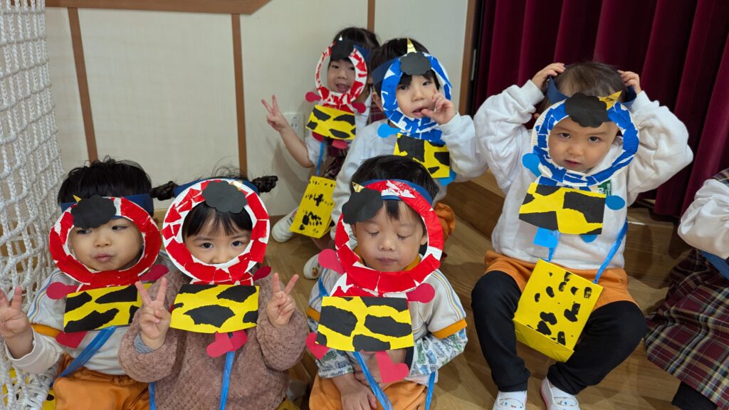 鬼と一緒に写真を撮りました。 つき、ほし、そよかぜ組は、新聞豆を使って鬼退治をしました。 節分の集い 本日の鬼を紹介しました! 鬼の正体は…青鬼(伊倉先生)・赤鬼(筧先生)でした。 鬼も一緒に豆拾いをしました。 つき組(鬼の顔のシールを貼り枡を作りました。クレヨンを使って鬼のお面を作りました。) ほし組(折り紙をちぎって鬼のパンツの枡を作りました。お面は花紙を使って作りました。) そよかぜ組(枡は、絵の具で模様を付けました。お面は貼り絵をしました。) にじ組(枡は折り紙を使って鬼を折って作りました。貼り絵をして鬼の帽子を作りました。) そら組(枡は、画用紙を使って鬼の顔を作りました。お面は、カラーセロハンを使って鬼のメガネを作りました。) おひさま組(枡は画用紙を折りつくりました。お面は、自分の顔の大きさに切り抜いて貼り絵をしました。) 2025 2025年度一覧② 節分の集い